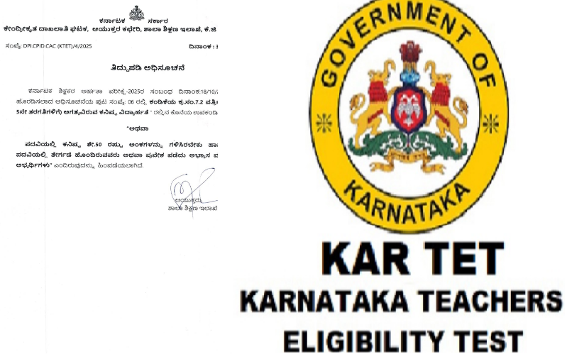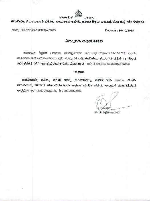 ಕರ್ನಾಟಕ ಶಿಕ್ಷಕರ ಅರ್ಹತಾ ಪರೀಕ್ಷೆ-2025ರ ಸಂಬಂಧ ದಿನಾಂಕ:18/10/2025 ರಂದು ಹೊರಡಿಸಲಾದ ಅಧಿಸೂಚನೆಯ ಪುಟ ಸಂಖ್ಯೆ: 06 ರಲ್ಲಿ ಕಂಡಿಕೆಯ ಕ್ರ.ಸಂ.7.2 ಪತ್ರಿಕೆ-1 (1 ರಿಂದ 5ನೇ ತರಗತಿಗಳಿಗೆ) ಅಗತ್ಯವಿರುವ ಕನಿಷ್ಟ ವಿದ್ಯಾರ್ಹತೆ – ರಲ್ಲಿನ ಕೊನೆಯ ಉಪಕಂಡಿಕೆಯಾದ”ಅಥವಾ ಪದವಿಯಲ್ಲಿ ಕನಿಷ್ಠ ಶೇ.50 ರಷ್ಟು ಅಂಕಗಳನ್ನು ಗಳಿಸಿರಬೇಕು ಹಾಗೂ ಬಿ.ಇಡಿ ಪದವಿಯಲ್ಲಿ ತೇರ್ಗಡೆ ಹೊಂದಿರುವವರು ಅಥವಾ ಪ್ರವೇಶ ಪಡೆದು ಅಭ್ಯಾಸ ಮಾಡುತ್ತಿರುವ ಅಭ್ಯರ್ಥಿಗಳು” ಎಂದಿರುವುದನ್ನು ಹಿಂಪಡೆಯಲಾಗಿದೆ.