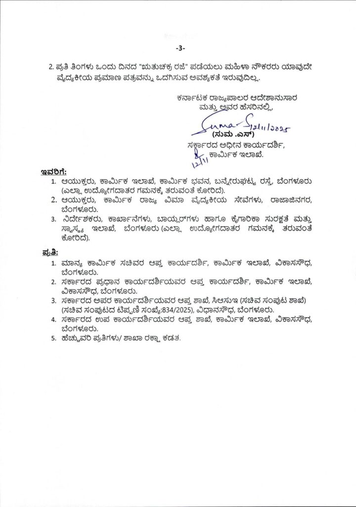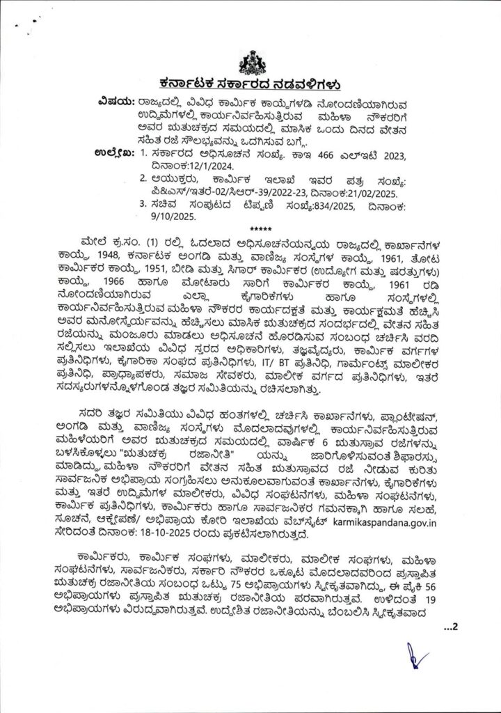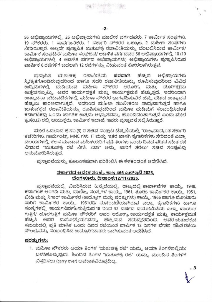 ಪ್ರಸ್ತಾವನೆಯಲ್ಲಿ ವಿವರಿಸಿರುವ ಹಿನ್ನೆಲೆಯಲ್ಲಿ, ರಾಜ್ಯದಲ್ಲಿ ಕಾರ್ಖಾನೆಗಳ ಕಾಯ್ದೆ, 1948, ಕರ್ನಾಟಕ ಅಂಗಡಿ ಮತ್ತು ವಾಣಿಜ್ಯ ಸಂಸ್ಥೆಗಳ ಕಾಯ್ದೆ, 1961, ತೋಟ ಕಾರ್ಮಿಕರ ಕಾಯ್ದೆ, 1951, ಬೀಡಿ ಮತ್ತು ಸಿಗಾರ್ ಕಾರ್ಮಿಕರ (ಉದ್ಯೋಗ ಮತ್ತು ಷರತ್ತುಗಳು) ಕಾಯ್ದೆ, 1966 ಹಾಗೂ ಮೋಟಾರು ಸಾರಿಗೆ ಕಾರ್ಮಿಕರ ಕಾಯ್ದೆ, 1961ರಡಿ ನೋಂದಣಿಯಾಗಿರುವ ಎಲ್ಲಾ ಕೈಗಾರಿಕೆಗಳು ಹಾಗೂ ಸಂಸ್ಥೆಗಳಲ್ಲಿ ಕಾರ್ಯನಿರ್ವಹಿಸುತ್ತಿರುವ 18 ರಿಂದ 52 ವರ್ಷದ ವಯೋಮಿತಿಯ ಎಲ್ಲಾ ಖಾಯಂ/ಗುತ್ತಿಗೆ/ ಹೊರಗುತ್ತಿಗೆ ಮಹಿಳಾ ನೌಕರರಿಗೆ ಅವರ ಆರೋಗ್ಯ, ಕಾರ್ಯದಕ್ಷತೆ ಮತ್ತು ಕಾರ್ಯಕ್ಷಮತೆ ಹೆಚ್ಚಿಸಿ ಅವರ ಮನೋಸ್ಥೆರ್ಯವನ್ನು ಹೆಚ್ಚಿಸುವ ಸದುದ್ದೇಶದಿಂದ, ಅವರ ಋತುಚಕ್ರದ ಸಮಯದಲ್ಲಿ ಪ್ರತಿ ಮಾಸಿಕ ಒಂದು ದಿನದ ರಜೆಯಂತೆ ವಾರ್ಷಿಕ 12 ದಿನಗಳ ವೇತನ ಸಹಿತ ರಜೆಯ ಸೌಲಭ್ಯವನ್ನು ಸಂಬಂಧಿಸಿದ ಉದ್ಯೋಗದಾತರು ಒದಗಿಸುವಂತೆ ಆದೇಶಿಸಿದೆ.