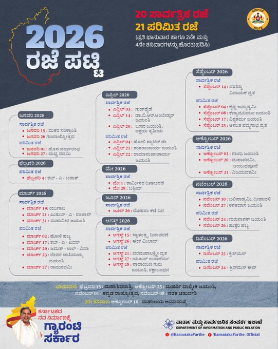 ಬೆಂಗಳೂರು: 2026ನೇ ಸಾಲಿಗೆ 20 ಸಾರ್ವತ್ರಿಕ ರಜಾ ದಿನಗಳನ್ನು ಗೊತ್ತುಪಡಿಸಿ ಅಧಿಸೂಚನೆ ಹೊರಡಿಸಲು ಮುಖ್ಯಮಂತ್ರಿ ಸಿದ್ದರಾಮಯ್ಯ ಅಧ್ಯಕ್ಷತೆಯಲ್ಲಿ ಗುರುವಾರ ನಡೆದ ಸಚಿವ ಸಂಪುಟ ಸಭೆಯಲ್ಲಿ ಒಪ್ಪಿಗೆ ನೀಡಲಾಗಿದೆ.