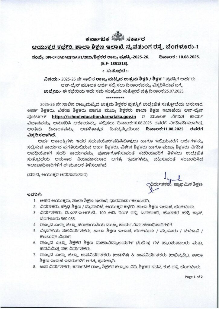 2025-26 ನೇ ಸಾಲಿನ ರಾಜ್ಯಮಟ್ಟದ ಉತ್ತಮ ಶಿಕ್ಷಕರ ಪ್ರಶಸ್ತಿಗೆ ಉಲ್ಲೇಖಿತ ಸುತ್ತೋಲೆಯ ಅನುಸಾರ, ಅರ್ಹ ಶಿಕ್ಷಕರು, ವಿಶೇಷ ಶಿಕ್ಷಕರು ಹಾಗೂ ಮುಖ್ಯ ಶಿಕ್ಷಕರು ಶಾಲಾ ಶಿಕ್ಷಣ ಇಲಾಖೆಯ ಆನ್-ಲೈನ್ https://schooleducation.karnataka.gov.in ವಿಧಾನವನ್ನು ಅನುಸರಿಸಿ ಅರ್ಜಿಯನ್ನು ಸಲ್ಲಿಸಲು ದಿನಾಂಕ:10.08.2025 ರವರೆಗೆ ನಿಗದಿಪಡಿಸಲಾಗಿದ್ದ ಅಂತಿಮ ದಿನಾಂಕವನ್ನು ಆಡಳಿತಾತ್ಮಕ ವಿಸ್ತರಿಸಲಾಗಿದೆ. ಹಿತದೃಷ್ಟಿಯಿಂದ ದಿನಾಂಕ:11.08.2025 ರವರೆಗೆ ವಿಸ್ತರಿಸಲಾಗಿದೆ.