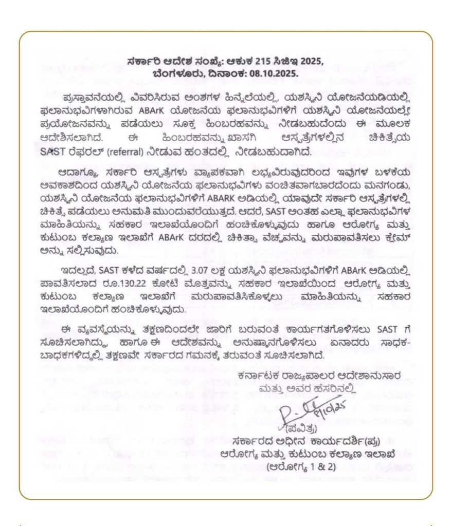 ಪ್ರಸ್ತಾವನೆಯಲ್ಲಿ ವಿವರಿಸಿರುವ ಅಂಶಗಳ ಹಿನ್ನೆಲೆಯಲ್ಲಿ, ಯಶಸ್ವಿನಿ ಯೋಜನೆಯಡಿಯಲ್ಲಿ ಫಲಾನುಭವಿಗಳಾಗಿರುವ ABArK ಯೋಜನೆಯ ಫಲಾನುಭವಿಗಳಿಗೆ ಯಶಸ್ವಿನಿ ಯೋಜನೆಯಲ್ಲೇ ಪ್ರಯೋಜನವನ್ನು ಪಡೆಯಲು ಸೂಕ್ತ ಹಿಂಬರಹವನ್ನು ನೀಡಬಹುದೆಂದು ಈ ಮೂಲಕ ಆದೇಶಿಸಲಾಗಿದೆ. ಆಸ್ಪತ್ರೆಗಳಲ್ಲಿನ ಚಿಕಿತ್ಸೆಯ ಈ ಹಿಂಬರಹವನ್ನು ಖಾಸಗಿ SAST ರೆಫರಲ್ (referral) ನೀಡುವ ಹಂತದಲ್ಲಿ ನೀಡಬಹುದಾಗಿದೆ.