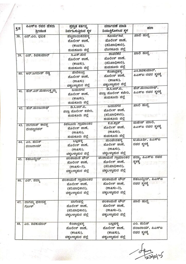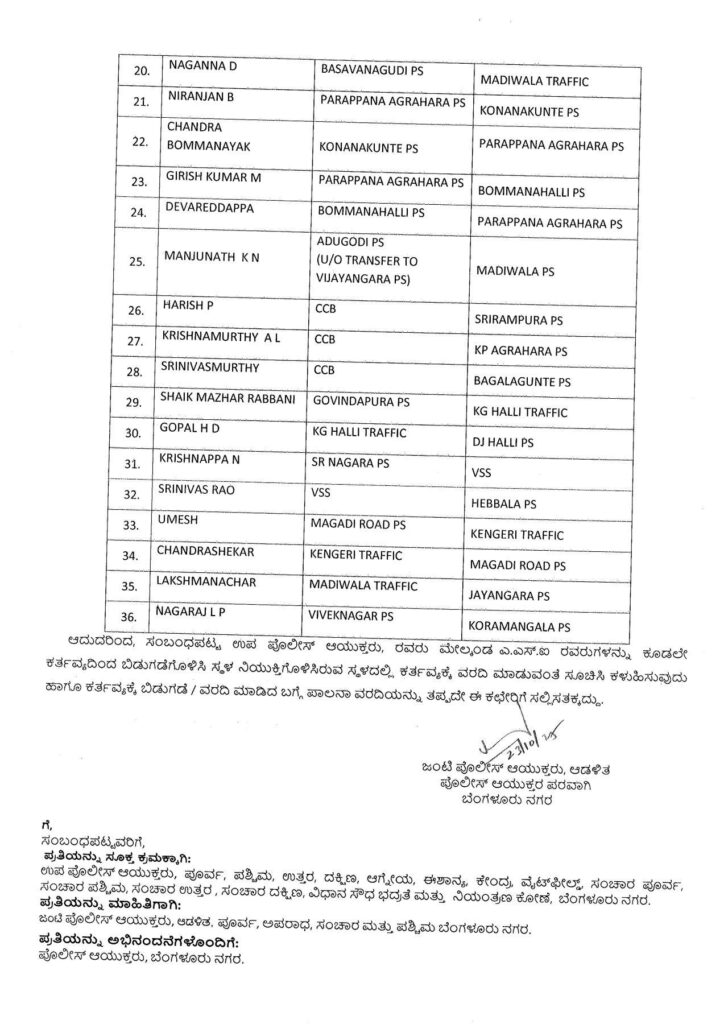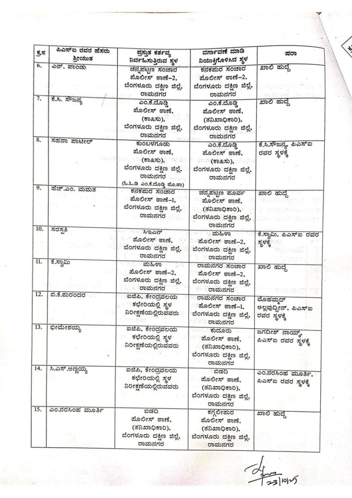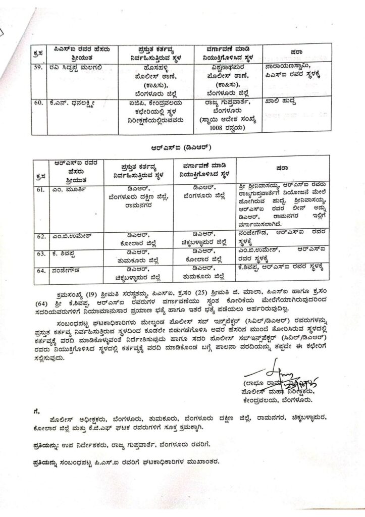 ಮೇಲ್ಕಂಡ ವಿಷಯ ಮತ್ತು ಉಲ್ಲೇಖಕ್ಕೆ ಸಂಬಂಧಿಸಿದಂತೆ, ಕೇಂದ್ರವಲಯದಲ್ಲಿ ಕರ್ತವ್ಯ ನಿರ್ವಹಿಸುತ್ತಿರುವ ಮತ್ತು ಸ್ಥಳ ನಿರೀಕ್ಷಣೆಯಲ್ಲಿರುವ ಈ ಕೆಳಕಂಡ ಪೊಲೀಸ್ ಸಬ್ ಇನ್ಸ್ಪೆಕ್ಟರ್ (ಸಿವಿಲ್ ಮತ್ತು ಡಿಎಆರ್) ರವರುಗಳನ್ನು ಸಾರ್ವಜನಿಕ/ಕಾನೂನು ಮತ್ತು ಸುವ್ಯವಸ್ಥೆ ಹಿತದೃಷ್ಟಿಯ ಮೇರೆಗೆ ಅವರುಗಳ ಹೆಸರಿನ ಮುಂದೆ ತೋರಿಸಿರುವ ಸ್ಥಳಕ್ಕೆ ಈ ತಕ್ಷಣದಿಂದ ಜಾರಿಗೆ ಬರುವಂತೆ ವರ್ಗಾವಣೆ ಮಾಡಿ ಸ್ಥಳ ನಿಯುಕ್ತಿ ಮಾಡಲಾಗಿದೆ.