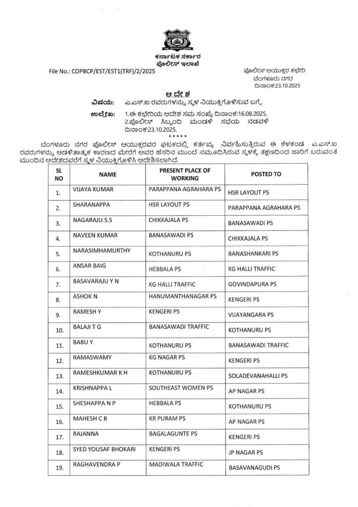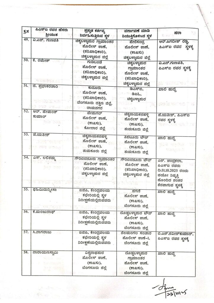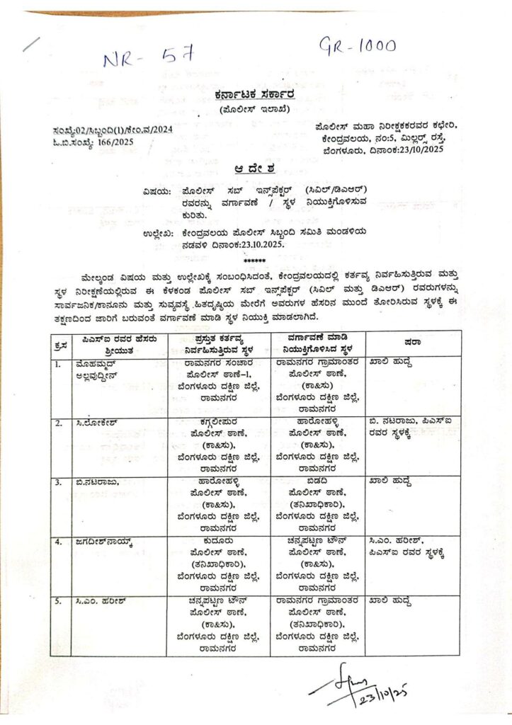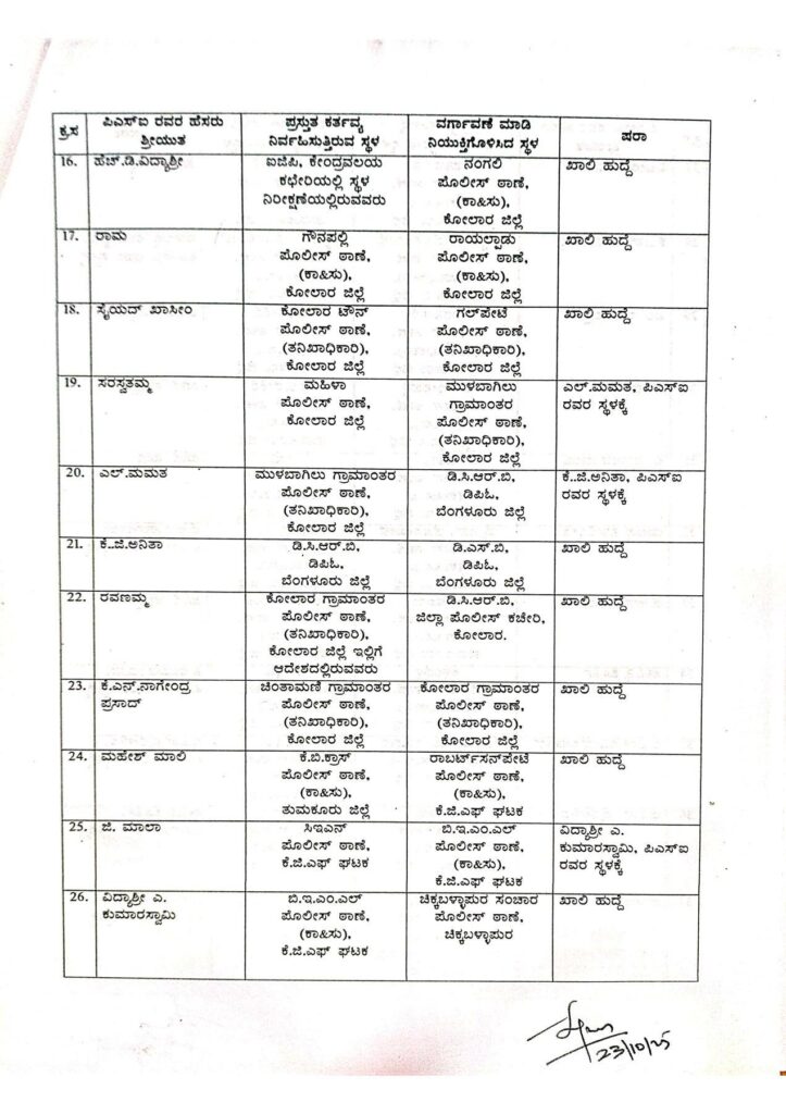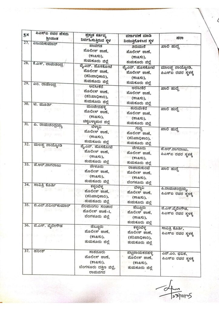 ಮೇಲ್ಕಂಡ ವಿಷಯ ಮತ್ತು ಉಲ್ಲೇಖಕ್ಕೆ ಸಂಬಂಧಿಸಿದಂತೆ, ಕೇಂದ್ರವಲಯದಲ್ಲಿ ಕರ್ತವ್ಯ ನಿರ್ವಹಿಸುತ್ತಿರುವ ಮತ್ತು ಸ್ಥಳ ನಿರೀಕ್ಷಣೆಯಲ್ಲಿರುವ ಈ ಕೆಳಕಂಡ ಪೊಲೀಸ್ ಸಬ್ ಇನ್ಸ್ಪೆಕ್ಟರ್ (ಸಿವಿಲ್ ಮತ್ತು ಡಿಎಆರ್) ರವರುಗಳನ್ನು ಸಾರ್ವಜನಿಕ/ಕಾನೂನು ಮತ್ತು ಸುವ್ಯವಸ್ಥೆ ಹಿತದೃಷ್ಟಿಯ ಮೇರೆಗೆ ಅವರುಗಳ ಹೆಸರಿನ ಮುಂದೆ ತೋರಿಸಿರುವ ಸ್ಥಳಕ್ಕೆ ಈ ತಕ್ಷಣದಿಂದ ಜಾರಿಗೆ ಬರುವಂತೆ ವರ್ಗಾವಣೆ ಮಾಡಿ ಸ್ಥಳ ನಿಯುಕ್ತಿ ಮಾಡಲಾಗಿದೆ.