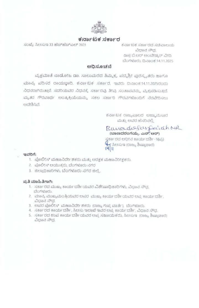 ಸಾಲು ಮರದ ತಿಮ್ಮಕ್ಕ ಅವರ ಅಂತ್ಯಕ್ರಿಯೆಯನ್ನು ಸಕಲ ಸರ್ಕಾರಿ ಗೌರವದೊಂದಿಗೆ ನಡೆಸಲಾಗುವುದು. ತಿಮ್ಮಕ್ಕ ಅವರ ಅಂತ್ಯಕ್ರಿಯೆಯ ಬಗ್ಗೆ ಕುಟುಂಬದವರು ಎರಡು ಮೂರು ಸ್ಥಳಗಳನ್ನು ಗೊತ್ತು ಮಾಡಿದ್ದು, ಅಂತ್ಯಕ್ರಿಯೆ ಎಲ್ಲಿ ಮಾಡಬೇಕೆಂದು ಸದ್ಯದಲ್ಲಿಯೇ ನಿರ್ಧರಿಸಲಾಗುವುದು. pic.twitter.com/FJlfhyRowJ