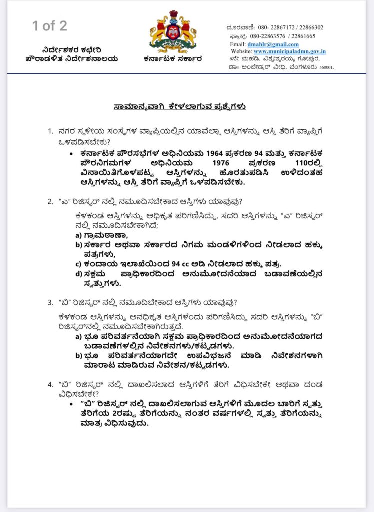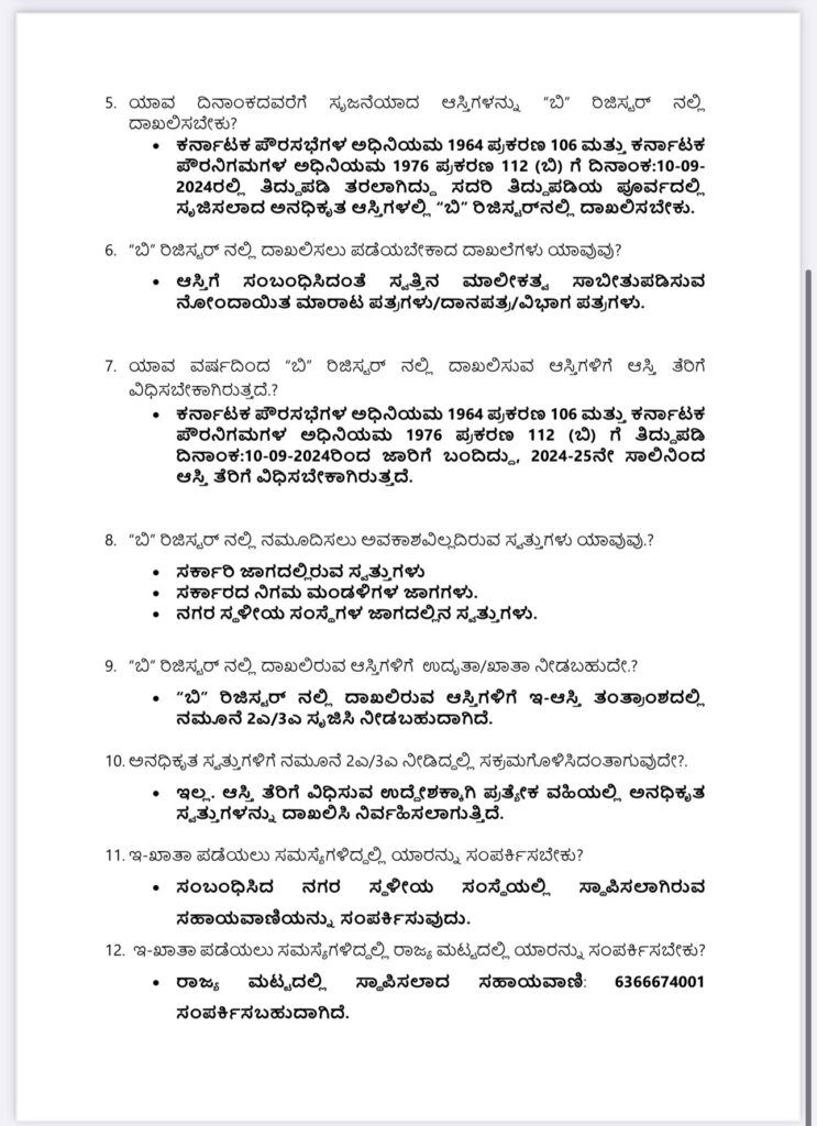ಇಲ್ಲ. ಆಸ್ತಿ ತೆರಿಗೆ ವಿಧಿಸುವ ಉದ್ದೇಶಕ್ಕಾಗಿ ಪ್ರತ್ಯೇಕ ವಹಿಯಲ್ಲಿ ಅನಧಿಕೃತ ಸ್ವತ್ತುಗಳನ್ನು ದಾಖಲಿಸಿ ನಿರ್ವಹಿಸಲಾಗುತ್ತಿದೆ. - ಇ-ಖಾತಾ ಪಡೆಯಲು ಸಮಸ್ಯೆಗಳಿದ್ದಲ್ಲಿ ಯಾರನ್ನು ಸಂಪರ್ಕಿಸಬೇಕು?