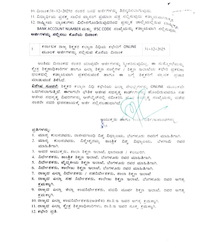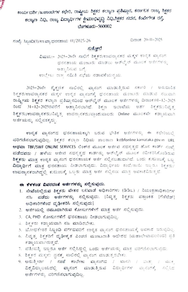 2025-26ನೇ ಶೈಕ್ಷಣಿಕ ಸಾಲಿನಲ್ಲಿ ವ್ಯಾಸಂಗ ಮಾಡುತ್ತಿರುವ ಸರ್ಕಾರಿ / ಅನುದಾನಿತ ಶಿಕ್ಷಕರ/ಉಪನ್ಯಾಸಕರ ಮಕ್ಕಳ ಉನ್ನತ ವ್ಯಾಸಂಗಕ್ಕೆ ಧನಸಹಾಯ ಮಂಜೂರು ಮಾಡುವ ಸಲುವಾಗಿ ರಾಷ್ಟ್ರೀಯ ಶಿಕ್ಷಕರ ಕಲ್ಯಾಣ ಪ್ರತಿಷ್ಠಾನದಿಂದ ಆನ್ಲೈನ್ ಮೂಲಕ ಅರ್ಜಿಗಳನ್ನು ದಿನಾಂಕ:01-12-2025 ರಿಂದ 31-12-2025ರವರೆಗೆ ಆಹ್ವಾನಿಸಲಾಗಿದೆ. ಶಿಕ್ಷಣ ಇಲಾಖೆಯ ಅರ್ಹ ಶಿಕ್ಷಕರು/ನಿವೃತ್ತ ಶಿಕ್ಷಕರು/ಉಪನ್ಯಾಸಕರು/ನಿವೃತ್ತ ಉಪನ್ಯಾಸಕರು/ಪ್ರಾಂಶುಪಾಲರು Online ಮೂಲಕವೇ ಕಡ್ಡಾಯವಾಗಿ ಅರ್ಜಿಯನ್ನು ಸಲ್ಲಿಸತಕ್ಕದ್ದು.
