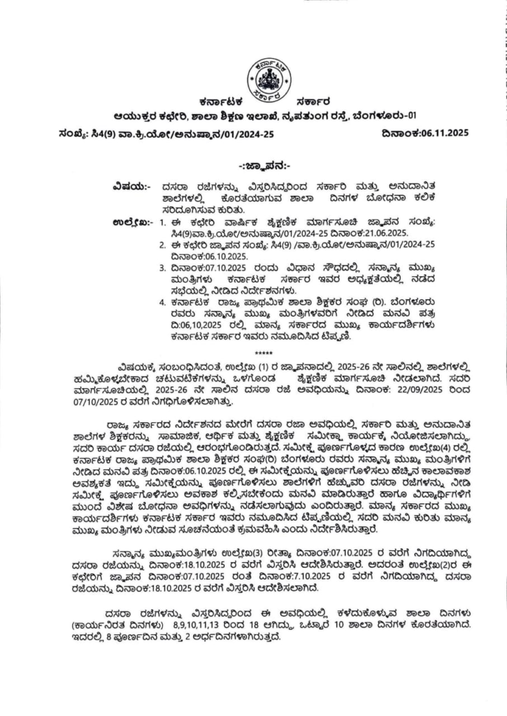 2025-26 ನೇ ಸಾಲಿನಲ್ಲಿ ಶಾಲೆಗಳಲ್ಲಿ ಹಮ್ಮಿಕೊಳ್ಳಬೇಕಾದ ಚಟುವಟಿಕೆಗಳನ್ನು ಒಳಗೊಂಡ ಶೈಕ್ಷಣಿಕ ಮಾರ್ಗಸೂಚಿ ನೀಡಲಾಗಿದೆ. ಸದರಿ ಮಾರ್ಗಸೂಚಿಯಲ್ಲಿ 2025-26 ನೇ ಸಾಲಿನ ದಸರಾ ರಜೆ ಅವಧಿಯನ್ನು ದಿನಾಂಕ: 22/09/2025 ರಿಂದ 07/10/2025 ರ ವರೆಗೆ ನಿಗದಿಗೊಳಿಸಲಾಗಿತ್ತು.