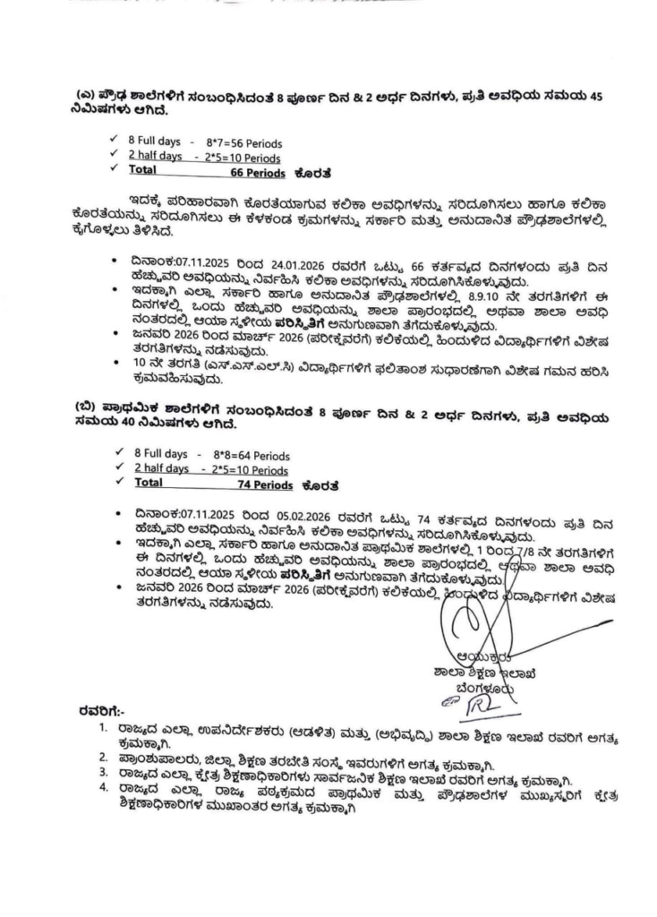 ದಿನಾಂಕ:07.11.2025 ರಿಂದ 24.01.2026 ರವರೆಗೆ ಒಟ್ಟು 66 ಕರ್ತವ್ಯದ ದಿನಗಳಂದು ಪ್ರತಿ ದಿನ ಹೆಚ್ಚುವರಿ ಅವಧಿಯನ್ನು ನಿರ್ವಹಿಸಿ ಕಲಿಕಾ ಅವಧಿಗಳನ್ನು ಸರಿದೂಗಿಸಿಕೊಳ್ಳುವುದು.