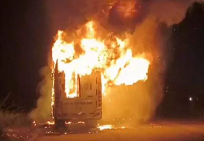 ವಿಜಯವಾಡ-ಹೈದರಾಬಾದ್ ರಾಷ್ಟ್ರೀಯ ಹೆದ್ದಾರಿಯ ನಲ್ಗೊಂಡ ಜಿಲ್ಲೆಯ ಚಿತ್ಯಾಲ ಮಂಡಲದ ವೆಲಿಮಿನೇಡು ಎಂಬಲ್ಲಿ ‘ವಿಹಾರಿ’ ಖಾಸಗಿ ಬಸ್ನಲ್ಲಿ ಬೆಂಕಿ ಕಾಣಿಸಿಕೊಂಡಿದೆ. ಅದರಲ್ಲಿದ್ದ 29 ಪ್ರಯಾಣಿಕರು ಕಿಟಕಿಗಳನ್ನು ಒಡೆದು ಹೊರಗೆ ಹಾರಿದರು. ಇದರಿಂದ ದೊಡ್ಡ ಅಪಘಾತ ತಪ್ಪಿತು. ಬಸ್ ಸಿಬ್ಬಂದಿಗೆ ತಕ್ಷಣ ಮಾಹಿತಿ ನೀಡಿ ಪ್ರಯಾಣಿಕರಿಗೆ ಎಚ್ಚರಿಕೆ ನೀಡಲಾಯಿತು, ಆದ್ದರಿಂದ ಪ್ರಯಾಣಿಕರು ತಕ್ಷಣ ಬಸ್ನಿಂದ ಇಳಿದರು. ಮಾಹಿತಿ ಪಡೆದ ತಕ್ಷಣ, ಅಗ್ನಿಶಾಮಕ ದಳದ ಸಿಬ್ಬಂದಿ ತಕ್ಷಣ ಸ್ಥಳಕ್ಕೆ ತಲುಪಿದರು.ಆದರೆ, ಬಸ್ ಈಗಾಗಲೇ ಸಂಪೂರ್ಣವಾಗಿ ಸುಟ್ಟು ಹೋಗಿತ್ತು. ಘಟನೆಯ ಸಮಯದಲ್ಲಿ ಬಸ್ನಲ್ಲಿ 29 ಜನರಿದ್ದರು. ಅವರೆಲ್ಲರೂ ಸುರಕ್ಷಿತವಾಗಿ ಪಾರಾಗಿದ್ದರು.
