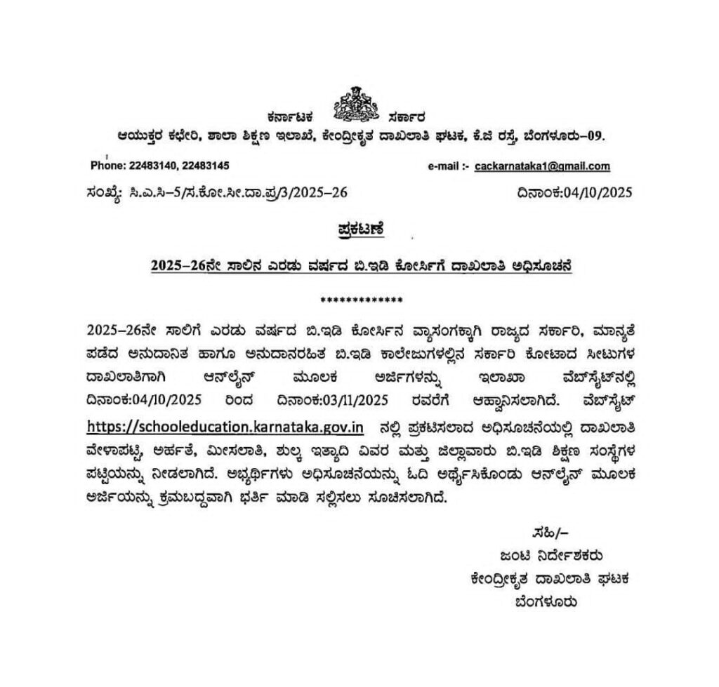 ಇಲಾಖಾ ವೆಬ್ಸೈಟ್ನಲ್ಲಿ :04/10/2025 ರಿಂದ ದಿನಾಂಕ:03/11/2025 ರವರೆಗೆ ಆಹ್ವಾನಿಸಲಾಗಿದೆ. ವೆಬ್ಸೈಟ್ https://schooleducation.karnataka.gov.in 3 ថជជ ដ ವೇಳಾಪಟ್ಟಿ, ಅರ್ಹತೆ, ಮೀಸಲಾತಿ, ಶುಲ್ಕ ಇತ್ಯಾದಿ ವಿವರ ಮತ್ತು ಜಿಲ್ಲಾವಾರು ಬಿ.ಇಡಿ ಶಿಕ್ಷಣ ಸಂಸ್ಥೆಗಳ ಪಟ್ಟಿಯನ್ನು ನೀಡಲಾಗಿದೆ. ಅಭ್ಯರ್ಥಿಗಳು ಅಧಿಸೂಚನೆಯನ್ನು ಓದಿ ಅರ್ಥೈಸಿಕೊಂಡು ಆನ್ಲೈನ್ ಮೂಲಕ ಅರ್ಜಿಯನ್ನು ಕ್ರಮಬದ್ದವಾಗಿ ಭರ್ತಿ ಮಾಡಿ ಸಲ್ಲಿಸಲು ಸೂಚಿಸಲಾಗಿದೆ.