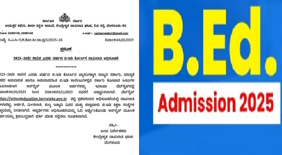 ಇಲಾಖಾ ವೆಬ್ಸೈಟ್ನಲ್ಲಿ :04/10/2025 ರಿಂದ ದಿನಾಂಕ:03/11/2025 ರವರೆಗೆ ಆಹ್ವಾನಿಸಲಾಗಿದೆ. ವೆಬ್ಸೈಟ್ https://schooleducation.karnataka.gov.in 3 ថជជ ដ ವೇಳಾಪಟ್ಟಿ, ಅರ್ಹತೆ, ಮೀಸಲಾತಿ, ಶುಲ್ಕ ಇತ್ಯಾದಿ ವಿವರ ಮತ್ತು ಜಿಲ್ಲಾವಾರು ಬಿ.ಇಡಿ ಶಿಕ್ಷಣ ಸಂಸ್ಥೆಗಳ ಪಟ್ಟಿಯನ್ನು ನೀಡಲಾಗಿದೆ. ಅಭ್ಯರ್ಥಿಗಳು ಅಧಿಸೂಚನೆಯನ್ನು ಓದಿ ಅರ್ಥೈಸಿಕೊಂಡು ಆನ್ಲೈನ್ ಮೂಲಕ ಅರ್ಜಿಯನ್ನು ಕ್ರಮಬದ್ದವಾಗಿ ಭರ್ತಿ ಮಾಡಿ ಸಲ್ಲಿಸಲು ಸೂಚಿಸಲಾಗಿದೆ.