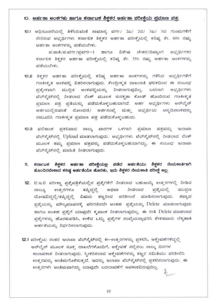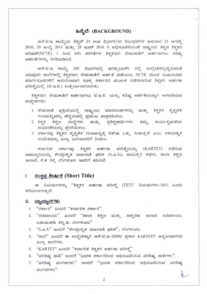 ಆರ್.ಟಿ.ಇ ಕಾಯ್ದೆ 2ನೇ ವಿಭಾಗದಲ್ಲಿ ಷರತ್ತು (ಎನ್) ನಲ್ಲಿ ಉಲ್ಲೇಖಿಸಲ್ಪಟ್ಟಿರುವಂತೆ ಯಾವುದೇ ಶಾಲೆಗಳಲ್ಲಿ ಶಿಕ್ಷಕರಾಗಿ ನೇಮಕಾತಿಗೆ ಅರ್ಹತೆ ಪಡೆಯಲು NCTE ಯಿಂದ ರೂಪಿಸಲಾದ ಮಾರ್ಗಸೂಚಿಗಳಿಗೆ ಅನುಗುಣವಾಗಿ ಸೂಕ್ತ ಸರ್ಕಾರದ ಮೂಲಕ ನಡೆಸಲಾಗುವ ಶಿಕ್ಷಕರ ಅರ್ಹತಾ ಪರೀಕ್ಷೆಯಲ್ಲಿ (ಟಿ.ಇ.ಟಿ.) ಉತ್ತೀರ್ಣರಾಗಿರಬೇಕು.