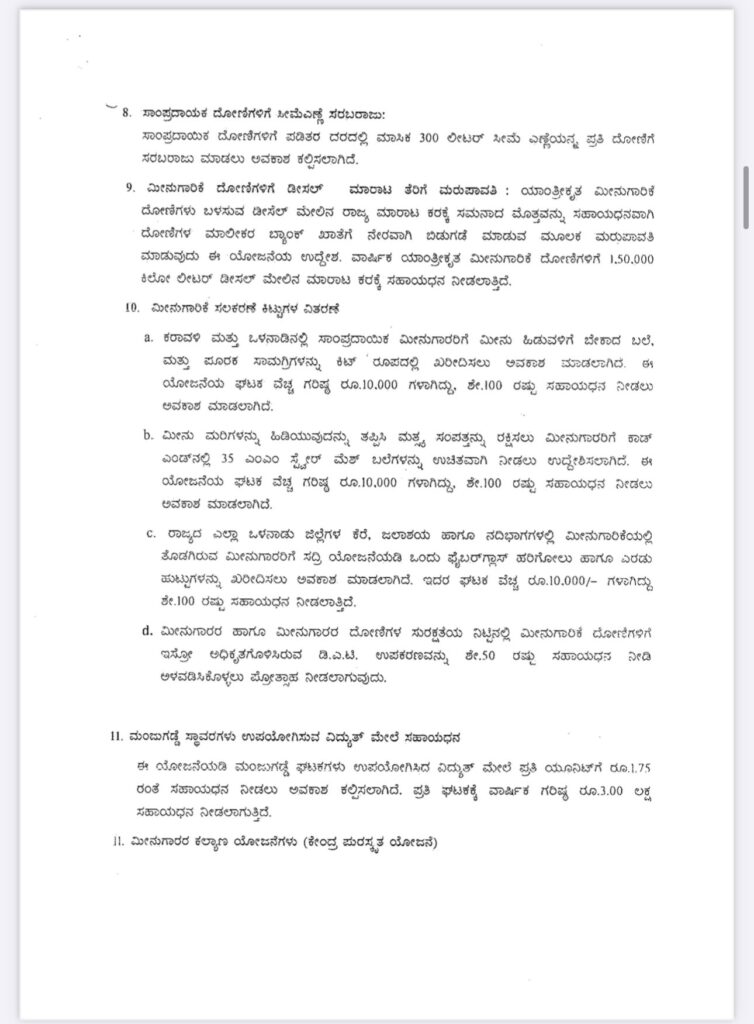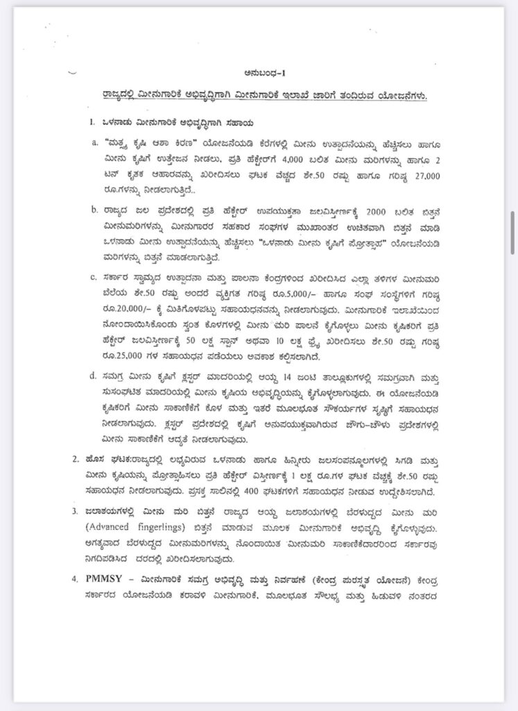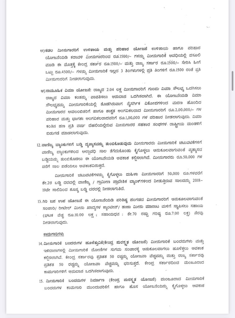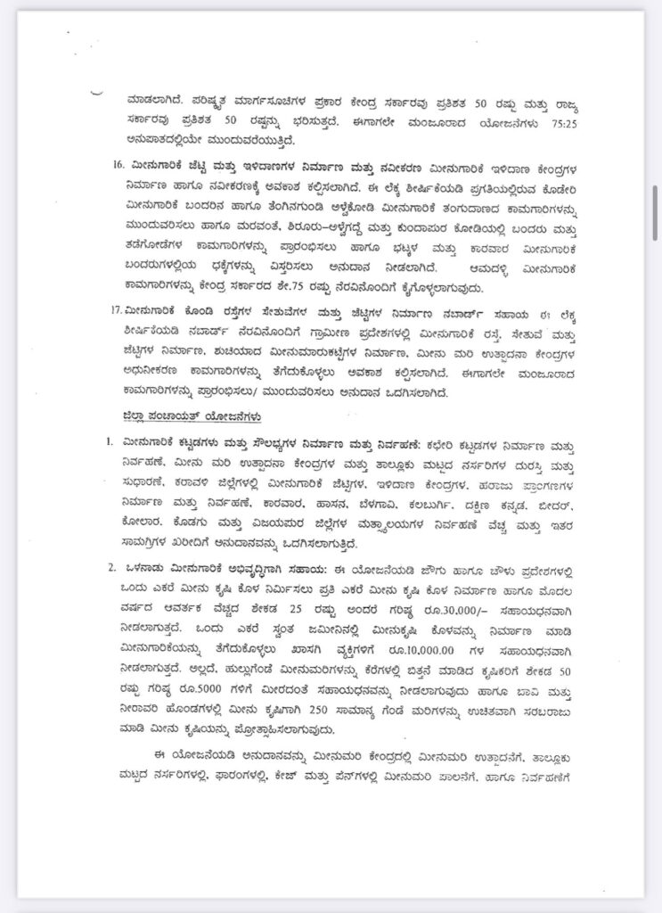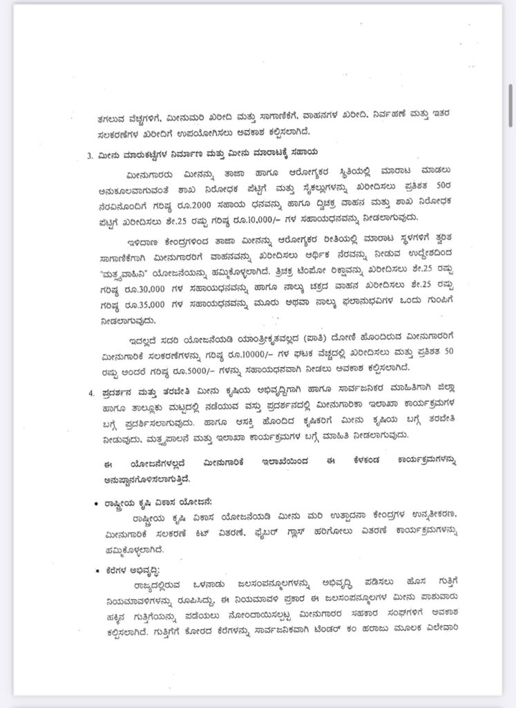 4. PMMSY ಮೀನುಗಾರಿಕೆ ಸಮಗ್ರ ಅಭಿವೃದ್ಧಿ ಮತ್ತು ನಿರ್ವಹಣೆ (ಕೇಂದ್ರ ಪುರಸ್ಕೃತ ಯೋಜನೆ) ಕೇಂದ್ರ ಸರ್ಕಾರದ ಯೋಜನೆಯಡಿ ಕರಾವಳಿ ಮೀನುಗಾರಿಕೆ, ಮೂಲಭೂತ ಸೌಲಭ್ಯ ಮತ್ತು ಹಿಡುವಳಿ ನಂತರದ ಕಾರ್ಯಾಚರಣೆಗಳ ಅಭಿವೃದ್ಧಿ, ಮೀನುಗಾರರ ಕಲ್ಯಾಣಕ್ಕಾಗಿ ರಾಷ್ಟ್ರೀಯ ಯೋಜನೆ, ಒಳನಾಡು ಮೀನುಗಾರಿಕೆ ಮತ್ತು ಜಲಕೃಷಿ ಅಭಿವೃದ್ಧಿ, ರಾಷ್ಟ್ರೀಯ ಮೀನುಗಾರಿಕೆ ಅಭಿವೃದ್ಧಿ ಮಂಡಳಿ ಮತ್ತು ಅದರ ಚಟುವಟಿಕೆಗಳು ಮತ್ತು ಇತರೆ ಕಾರ್ಯಕ್ರಮಗಳನ್ನು ಕೇಂದ್ರ ಸರ್ಕಾರದ ನೆರವಿನೊಂದಿಗೆ ಅನುಷ್ಠಾನಗೊಳಿಸಲು ಅವಕಾಶ ಕಲ್ಪಿಸಲಾಗಿದೆ.