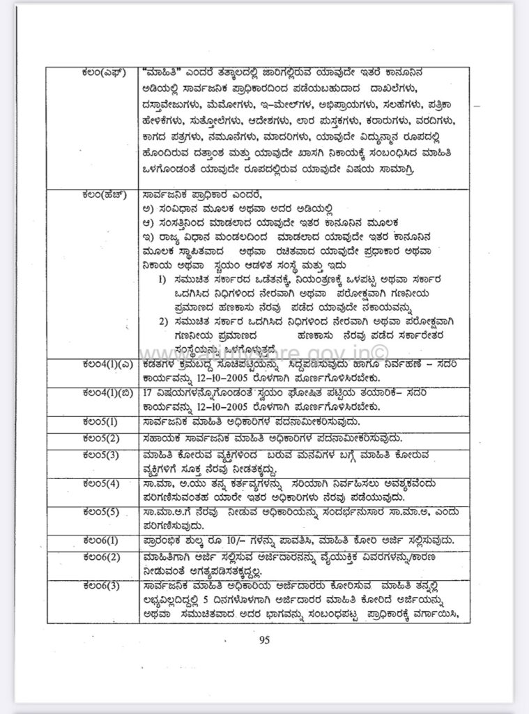 ಕಲಂ7(3) ಮಾಹಿತಿ ಶುಲ್ಕವನ್ನು ಲೆಕ್ಕಾಚಾರ ಮಾಡಿ ಲೆಕ್ಕಾಚಾರದೊಂದಿಗೆ ಅರ್ಜಿದಾರರಿಗೆ 30 ದಿನಗಳೊಳಗಾಗಿ ತಿಳಿಸುವುದು. ಮಾಹಿತಿ ಶುಲ್ಕ ಪ್ರತಿ ಪುಟ ಎ4 ಅಳತೆಗೆ ರೂ.2/-№ 4(1)(2) 4(1) (2) 1 0.1/-