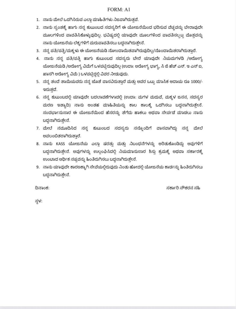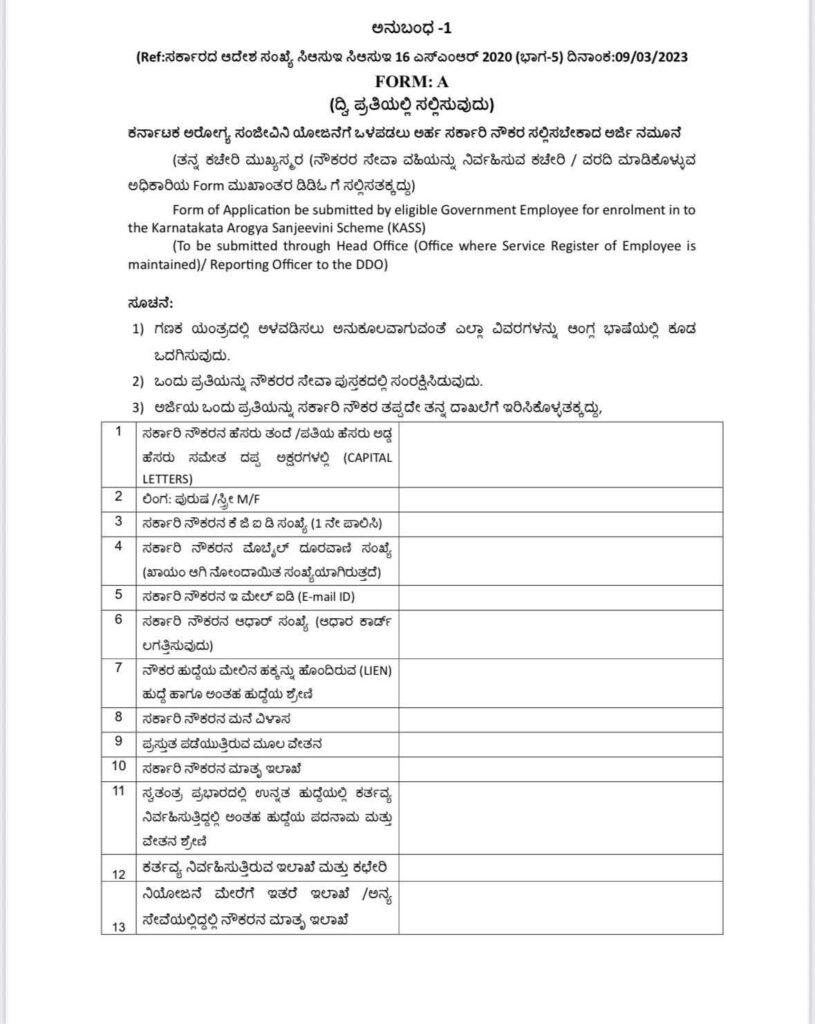ಬೆಂಗಳೂರು : ರಾಜ್ಯ ಸರ್ಕಾರಿ ನೌಕರರೇ ಗಮನಿಸಿ.. ಕರ್ನಾಟಕ ಆರೋಗ್ಯ ಸಂಜೀವಿನಿ ಯೋಜನೆಗೆ (KASS) ನೊಂದಾಯಿಸಿಕೊಳ್ಳಲು ತಮ್ಮ ಕುಟುಂಬದ ಎಲ್ಲಾ ಸದಸ್ಯರುಗಳ ಪಾಸ್ ಪೋರ್ಟ್ ಅಳತೆಯ ಪೋಟೋ ಗಳನ್ನು ಸ್ವಯಂ ದೃಡೀಕರಿಸಿ ನಿಗಧಿತ ನಮೂನೆಗಳನ್ನು ಭರ್ತಿ ಮಾಡಿ ಮೇಲಾಧಿಕಾರಿಗಳ ಮೂಲಕ ವೇತನ ಬಟವಾಡೆ ಅಧಿಕಾರಿಗಳಿಗೆ ಕೂಡಲೇ ಸಲ್ಲಿಸುವಂತೆ ಕೋರಿದೆ.