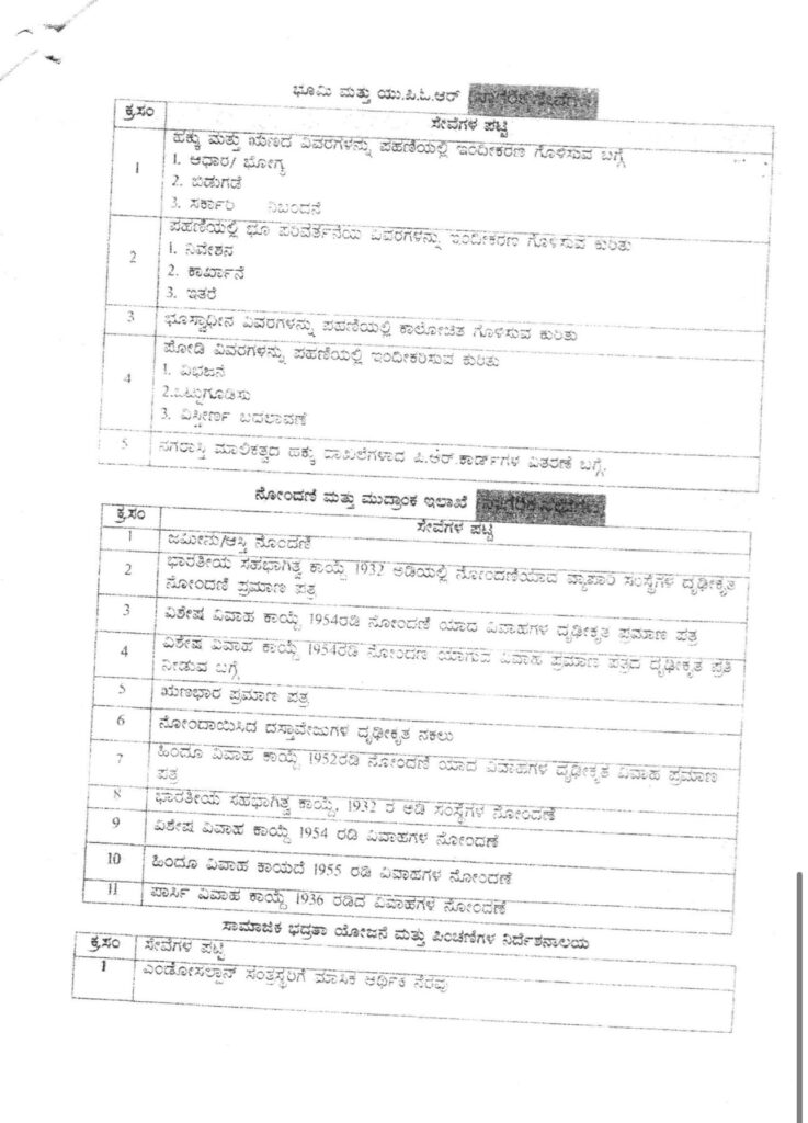 ಬೆಂಗಳೂರು :   ಕಂದಾಯ ಇಲಾಖೆಯಿಂದ ಭೂಮಿ ದಾಖಲೆಗಳು, ಆದಾಯ ಪ್ರಮಾಣಪತ್ರಗಳು, ಜಾತಿ ಪ್ರಮಾಣಪತ್ರಗಳು, ವಿವಾಹ ನೋಂದಣಿ, ದಸ್ತಾವೇಜು ನೋಂದಣಿ, ಮತ್ತು ಆಸ್ತಿ ಮೌಲ್ಯಮಾಪನ ಸೇರಿದಂತೆ ಹಲವು ಸೇವೆಗಳು ಲಭ್ಯವಿದೆ. ಈ ಸೇವೆಗಳನ್ನು ಆನ್‌ಲೈನ್‌ನಲ್ಲಿ ಸೇವಾ ಸಿಂಧು, ಸಕಾಲ, ಮತ್ತು ಕಾವೇರಿ ಆನ್‌ಲೈನ್ ಸೇವೆಗಳ ಮೂಲಕ ಪಡೆಯಬಹುದು.