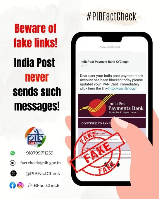 ಇಂಡಿಯಾ ಪೋಸ್ಟ್ ಸಂದೇಶಗಳ ಸೋಗಿನಲ್ಲಿ ಜನರನ್ನು ಮೋಸಗೊಳಿಸಲು ಪ್ರಯತ್ನಿಸುವ ಎಸ್ಎಂಎಸ್ ಹಗರಣಗಳು ಇತ್ತೀಚೆಗೆ ಹೆಚ್ಚುತ್ತಿರುವ ಬಗ್ಗೆ ಪ್ರೆಸ್ ಇನ್ಫಾರ್ಮೇಶನ್ ಬ್ಯೂರೋ (ಪಿಐಬಿ) ನಾಗರಿಕರನ್ನು ಎಚ್ಚರಿಸಿದೆ.