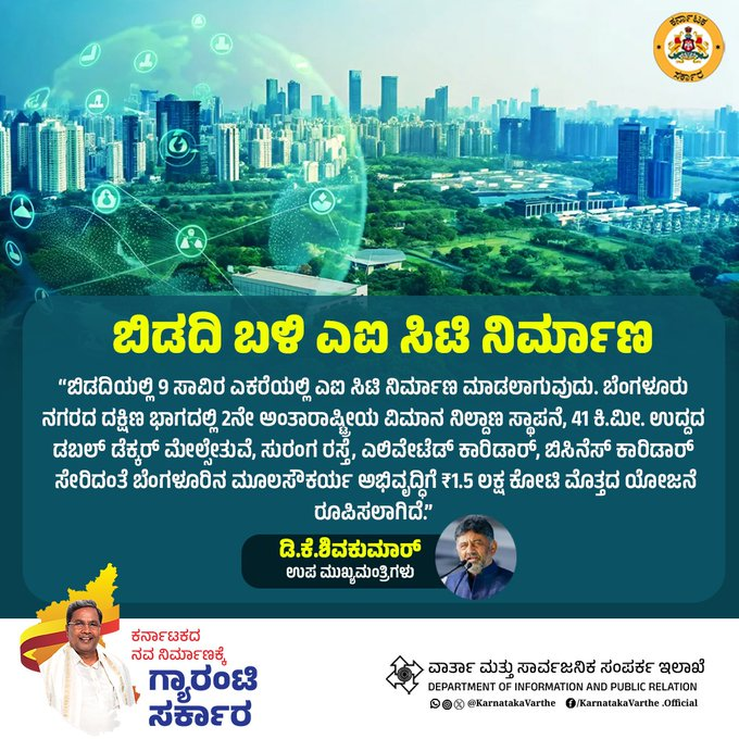 BIG NEWS: ಬಿಡದಿಯಲ್ಲಿ 9 ಸಾವಿರ ಎಕರೆಯಲ್ಲಿ ಎಐ ಸಿಟಿ, ಬೆಂಗಳೂರು ದಕ್ಷಿಣದಲ್ಲಿ 2ನೇ ಅಂತರಾಷ್ಟ್ರೀಯ ವಿಮಾನ ನಿಲ್ದಾಣ ನಿರ್ಮಾಣ