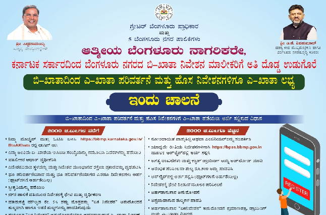 ಗ್ರೇಟರ್ ಬೆಂಗಳೂರು ಪ್ರಾಧಿಕಾರ ವ್ಯಾಪ್ತಿಯ ಬಿ-ಖಾತಾ ನಿವೇಶನ ಮಾಲೀಕರಿಗೆ ಬಿ-ಖಾತಾದಿಂದ ಎ-ಖಾತಾಗೆ ಪರಿವರ್ತನೆ ಮತ್ತು ಹೊಸ ನಿವೇಶನಗಳಿಗೂ ಎ-ಖಾತಾ ನೀಡಲು ಹೊಸದಾಗಿ ಜಾರಿಗೊಳಿಸಿರುವ ಆನ್ಲೈನ್ ವ್ಯವಸ್ಥೆಗೆ ಇಂದು ಚಾಲನೆ ದೊರೆತಿದೆ.