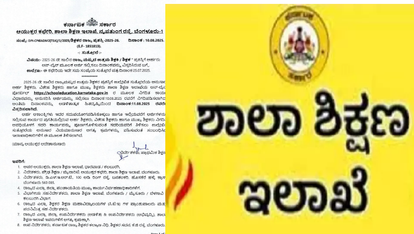 2025-26 ನೇ ಸಾಲಿನ ರಾಜ್ಯಮಟ್ಟದ ಉತ್ತಮ ಶಿಕ್ಷಕರ ಪ್ರಶಸ್ತಿಗೆ ಉಲ್ಲೇಖಿತ ಸುತ್ತೋಲೆಯ ಅನುಸಾರ, ಅರ್ಹ ಶಿಕ್ಷಕರು, ವಿಶೇಷ ಶಿಕ್ಷಕರು ಹಾಗೂ ಮುಖ್ಯ ಶಿಕ್ಷಕರು ಶಾಲಾ ಶಿಕ್ಷಣ ಇಲಾಖೆಯ ಆನ್-ಲೈನ್ https://schooleducation.karnataka.gov.in ವಿಧಾನವನ್ನು ಅನುಸರಿಸಿ ಅರ್ಜಿಯನ್ನು ಸಲ್ಲಿಸಲು ದಿನಾಂಕ:10.08.2025 ರವರೆಗೆ ನಿಗದಿಪಡಿಸಲಾಗಿದ್ದ ಅಂತಿಮ ದಿನಾಂಕವನ್ನು ಆಡಳಿತಾತ್ಮಕ ವಿಸ್ತರಿಸಲಾಗಿದೆ. ಹಿತದೃಷ್ಟಿಯಿಂದ ದಿನಾಂಕ:11.08.2025 ರವರೆಗೆ ವಿಸ್ತರಿಸಲಾಗಿದೆ.