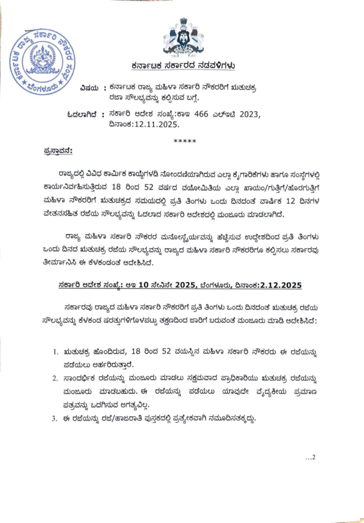 ರಾಜ್ಯದಲ್ಲಿ ವಿವಿಧ ಕಾರ್ಮಿಕ ಕಾಯ್ದೆಗಳಡಿ ನೋಂದಣಿಯಾಗಿರುವ ಎಲ್ಲಾ ಕೈಗಾರಿಕೆಗಳು ಹಾಗೂ ಸಂಸ್ಥೆಗಳಲ್ಲಿ ಕಾರ್ಯನಿರ್ವಹಿಸುತ್ತಿರುವ 18 ರಿಂದ 52 ವರ್ಷದ ವಯೋಮಿತಿಯ ಎಲ್ಲಾ ಖಾಯಂ/ಗುತ್ತಿಗೆ/ಹೊರಗುತ್ತಿಗೆ ಮಹಿಳಾ ನೌಕರರಿಗೆ ಋತುಚಕ್ರದ ಸಮಯದಲ್ಲಿ ಪ್ರತಿ ತಿಂಗಳು ಒಂದು ದಿನದಂತೆ ವಾರ್ಷಿಕ 12 ದಿನಗಳ ವೇತನಸಹಿತ ರಜೆಯ ಸೌಲಭ್ಯವನ್ನು ಓದಲಾದ ಸರ್ಕಾರಿ ಆದೇಶದಲ್ಲಿ ಮಂಜೂರು ಮಾಡಲಾಗಿದೆ.