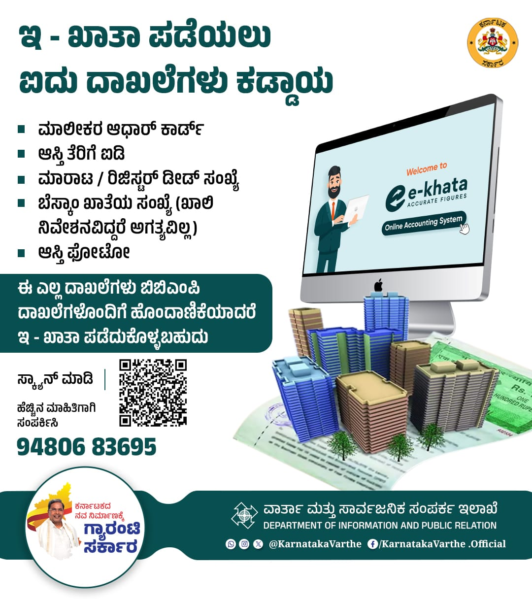 ಈ ಕುರಿತಂತೆ ಸಂಶಯವಿದ್ದಲ್ಲಿ ಇ – ಖಾತಾ ಸಹಾಯವಾಣಿ 94806 83695 ಗೆ ಕರೆ ಮಾಡಿ ಸಲಹೆ ಪಡೆಯಬಹುದು ಎಂದು ಸರ್ಕಾರ ಪ್ರಕಟಣೆ ಹೊರಡಿಸಿದೆ.