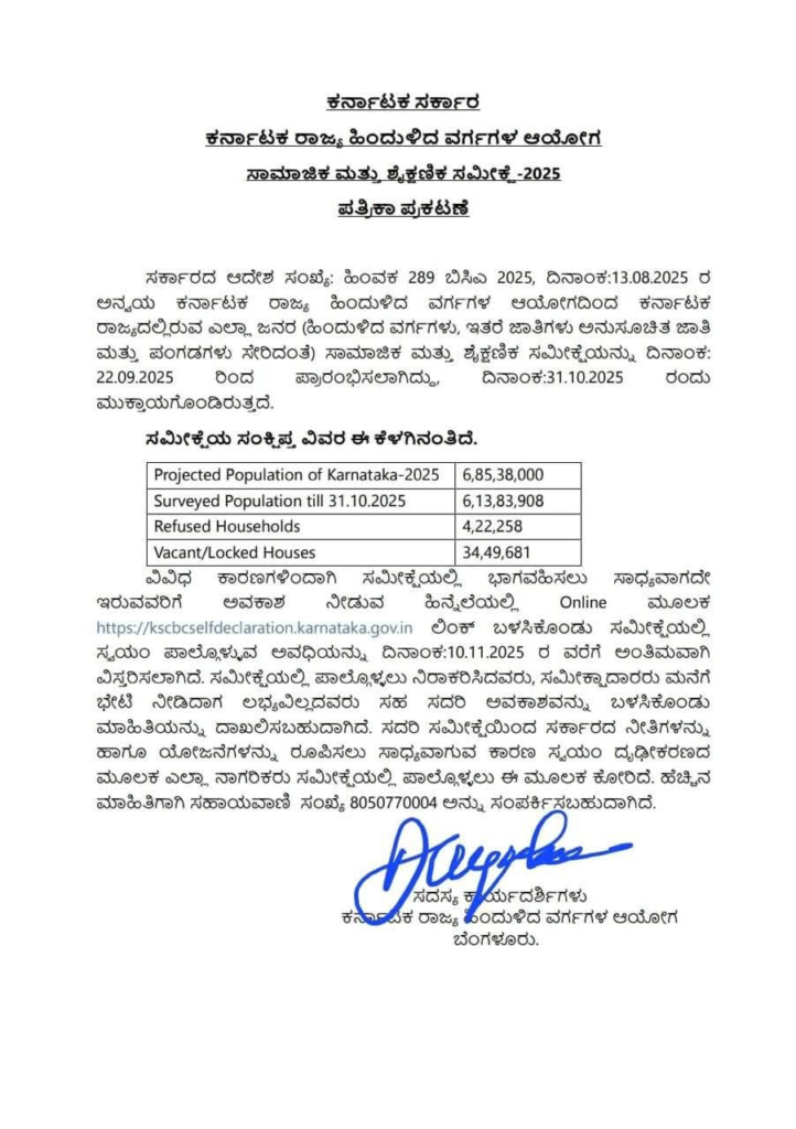 ಕರ್ನಾಟಕ ರಾಜ್ಯದ ಹಿಂದುಳಿದ ವರ್ಗಗಳ ಆಯೋಗದ ವತಿಯಿಂದ ನಡೆಸುತ್ತಿರುವ ಸಾಮಾಜಿಕ ಮತ್ತು ಶೈಕ್ಷಣಿಕ ಸಮೀಕ್ಷೆಯನ್ನು ದಿನಾಂಕ:22-09-2025 ರಂದು ಪ್ರಾರಂಭಿಸಲಾಗಿದ್ದು, ದಿನಾಂಕ:31-10-2025 ರಂದು ಮುಕ್ತಾಯಗೊಂಡಿದ್ದು, ವಿವಿಧ ಕಾರಣಗಳಿಂದಾಗಿ ಸಮೀಕ್ಷೆಯಲ್ಲಿ ಭಾಗವಹಿಸಲು ಸಾಧ್ಯವಾಗದೇ ಇರುವವರಿಗೆ Online Website: https://kscbcselfdeclaration.karnataka.gov.in ಮೂಲಕ ಸಮೀಕ್ಷೆಯಲ್ಲಿ ಸ್ವಯಂ ಪಾಲ್ಗೊಳ್ಳುವ ಅವಧಿಯನ್ನು ನ.10 ರವರೆಗೆ ಅಂತಿಮವಾಗಿ ವಿಸ್ತರಿಸಲಾಗಿದೆ.