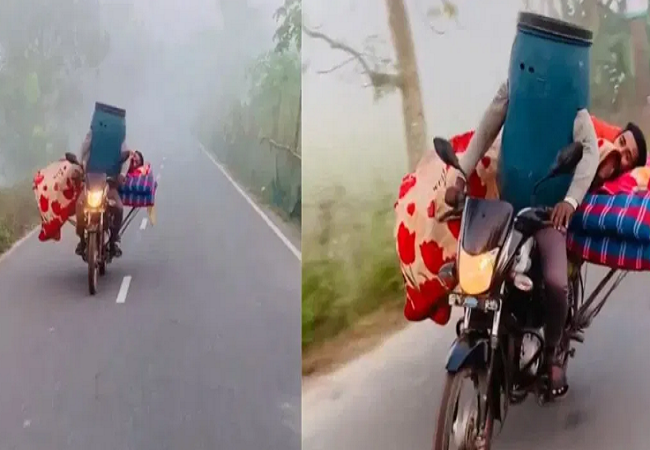 ಸಾಮಾಜಿಕ ಮಾಧ್ಯಮಗಳಲ್ಲಿ ಹರಿದಾಡುತ್ತಿರುವ ಈ ವಿಡಿಯೋದಲ್ಲಿ, ಒಬ್ಬ ವ್ಯಕ್ತಿ ಬೈಕ್ ಸವಾರಿ ಮಾಡುತ್ತಿರುವುದು ಕಂಡುಬರುತ್ತದೆ. ಆದರೆ ಅವನು ಸಾಮಾನ್ಯ ಜಾಕೆಟ್ ಧರಿಸಿಲ್ಲ. ಶೀತ ಗಾಳಿಯನ್ನು ತಡೆಯಲು, ಅವನು ತನ್ನ ದೇಹಕ್ಕೆ ಹೊಂದಿಕೊಳ್ಳಲು ದೊಡ್ಡ ನೀಲಿ ಪ್ಲಾಸ್ಟಿಕ್ ಡ್ರಮ್ ಅನ್ನು ಕತ್ತರಿಸಿ ಅದನ್ನು ಜಾಕೆಟ್ ನಂತೆ ಧರಿಸಿದ್ದಾನೆ. ರಸ್ತೆಯನ್ನು ನೋಡಲು ಅವನು ತನ್ನ ಕಣ್ಣುಗಳ ಬಳಿ ಎರಡು ಸಣ್ಣ ರಂಧ್ರಗಳನ್ನು ಮತ್ತು ಕೈಗಳನ್ನು ಹೊರಗೆ ಹಾಕಲು ಬದಿಗಳಲ್ಲಿ ರಂಧ್ರಗಳನ್ನು ಮಾಡಿದ್ದಾನೆ.