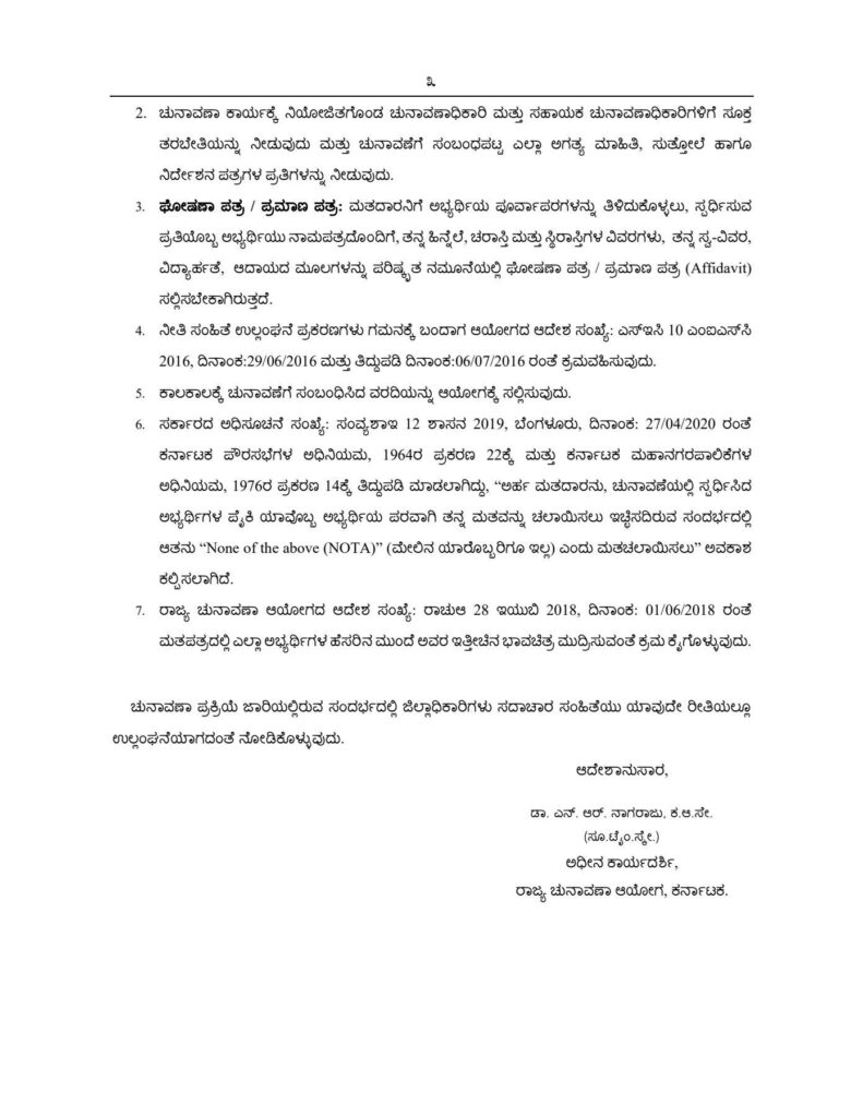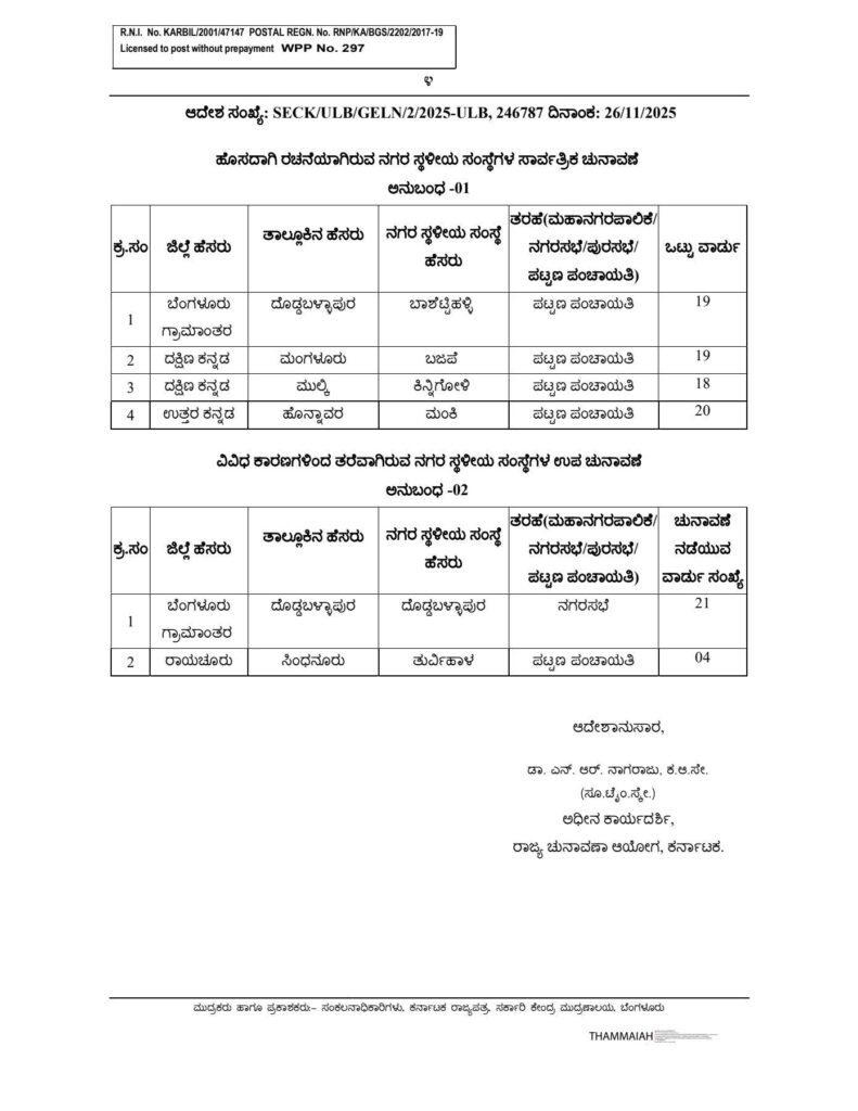ರಾಜ್ಯ ಚುನಾವಣಾ ಆಯೋಗವು ಸಂವಿಧಾನದ ಪರಿಚ್ಛೇದ 243-ಜೆಡ್ಎ ರಲ್ಲಿ ಪ್ರದತ್ತವಾದ ಅಧಿಕಾರದ ಮೇರೆಗೆ ಕರ್ನಾಟಕ ಪೌರಸಭೆಗಳ ಅಧಿನಿಯಮ, 1964 ರ ಪ್ರಕರಣ 17 ಮತ್ತು 19 ಹಾಗೂ ಕರ್ನಾಟಕ ಪೌರಸಭೆಗಳ (ಕೌನ್ಸಿಲರುಗಳ ಚುನಾವಣೆ) ನಿಯಮಗಳು, 1977ರ ನಿಯಮ 3(1) ರನ್ವಯ ಅನುಬಂಧ-01 ರಲ್ಲಿ ಹೆಸರಿಸಲಾದ ಹೊಸದಾಗಿ ರಚನೆಯಾಗಿರುವ 04 ಪಟ್ಟಣ ಪಂಚಾಯತಿಗಳಿಗೆ ಸಾರ್ವತ್ರಿಕ ಚುನಾವಣೆಯನ್ನು ಹಾಗೂ ನಗರ ಸ್ಥಳೀಯ ಸಂಸ್ಥೆಗಳಲ್ಲಿ ವಿವಿಧ ಕಾರಣಗಳಿಂದ ತೆರವಾಗಿರುವ ಅನುಬಂಧ -02 ರಲ್ಲಿ ಹೆಸರಿಸಲಾದ ವಾರ್ಡುಗಳಿಗೆ ಉಪ ಚುನಾವಣೆಯನ್ನು ಈ ಕೆಳಕಂಡ ಚುನಾವಣಾ ವೇಳಾಪಟ್ಟಿಯನುಸಾರ ನಡೆಸಲು ಆದೇಶಿಸಲಾಗಿದೆ.