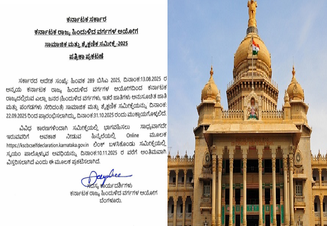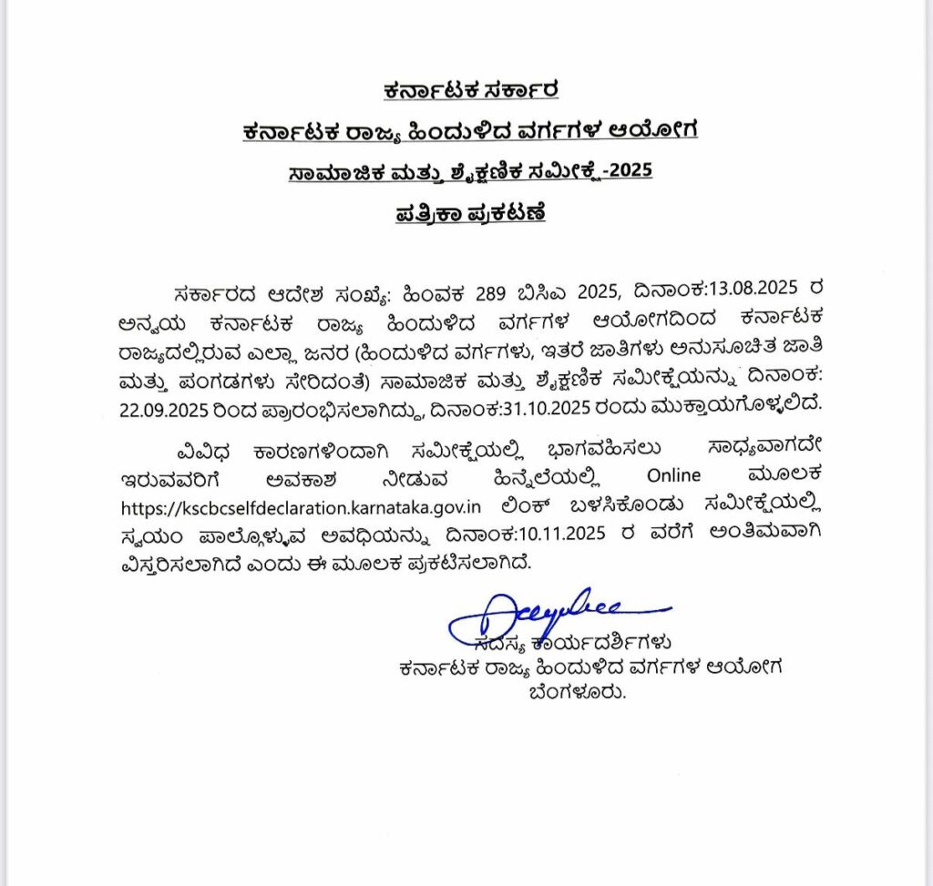 ವಿವಿಧ ಕಾರಣಗಳಿಂದಾಗಿ ಸಮೀಕ್ಷೆಯಲ್ಲಿ ಭಾಗವಹಿಸಲು ಸಾಧ್ಯವಾಗದೇ ಇರುವವರಿಗೆ ಅವಕಾಶ ನೀಡುವ ಹಿನ್ನೆಲೆಯಲ್ಲಿ https://kscbcselfdeclaration.karnataka.gov.in o wơ Online ಮೂಲಕ ಸ್ವಯಂ ಪಾಲ್ಗೊಳ್ಳುವ ಅವಧಿಯನ್ನು ದಿನಾಂಕ: 10.11.2025 ರ ವರೆಗೆ ಅಂತಿಮವಾಗಿ ವಿಸ್ತರಿಸಲಾಗಿದೆ ಎಂದು ಈ ಮೂಲಕ ಪ್ರಕಟಿಸಲಾಗಿದೆ.