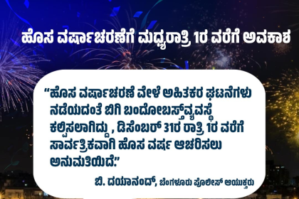 ಬೆಂಗಳೂರು : ಹೊಸ ವರ್ಷಾಚರಣೆಯ ಪ್ರಯುಕ್ತ ಡಿಸೆಂಬರ್ 31 ರಂದು ರಾತ್ರಿ 11 ರಿಂದ ಮಧ್ಯರಾತ್ರಿ…