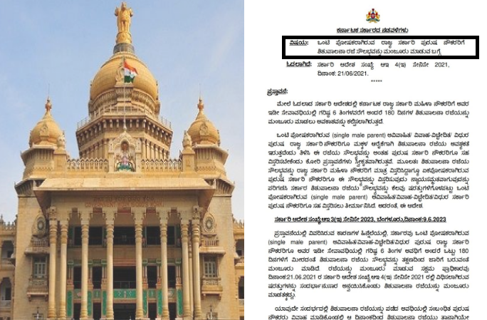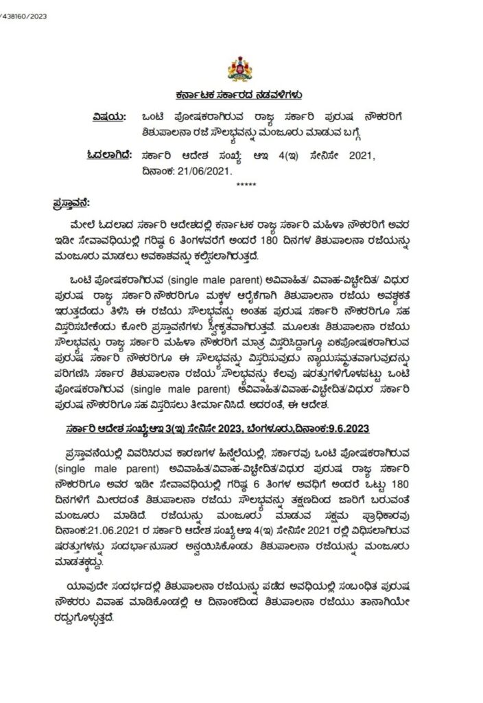 ಒಂಟಿ ಪೋಷಕರಾಗಿರುವ (single male parent) ಅವಿವಾಹಿತ/ ವಿವಾಹ-ವಿಚ್ಛೇದಿತ/ ವಿಧುರ ಪುರುಷ ರಾಜ್ಯ ಸರ್ಕಾರಿ ನೌಕರರಿಗೂ ಮಕ್ಕಳ ಆರೈಕೆಗಾಗಿ ಶಿಶುಪಾಲನಾ ರಜೆಯ ಅವಶ್ಯಕತೆ ಇರುತ್ತದೆಂದು ತಿಳಿಸಿ ಈ ರಜೆಯ ಸೌಲಭ್ಯವನ್ನು ಅಂತಹ ಪುರುಷ ಸರ್ಕಾರಿ ನೌಕರರಿಗೂ ಸಹ ವಿಸ್ತರಿಸಬೇಕೆಂದು ಕೋರಿ ಪ್ರಸ್ತಾವನೆಗಳು ಸ್ವೀಕೃತವಾಗಿರುತ್ತವೆ. ಮೂಲತಃ ಶಿಶುಪಾಲನಾ ರಜೆಯ ಸೌಲಭ್ಯವನ್ನು ರಾಜ್ಯ ಸರ್ಕಾರಿ ಮಹಿಳಾ ನೌಕರರಿಗೆ ಮಾತ್ರ ವಿಸ್ತರಿಸಿದ್ದಾಗ್ಯೂ ಏಕಪೋಷಕರಾಗಿರುವ ಪುರುಷ ಸರ್ಕಾರಿ ನೌಕರರಿಗೂ ಈ ಸೌಲಭ್ಯವನ್ನು ವಿಸ್ತರಿಸುವುದು ನ್ಯಾಯಸಮ್ಮತವಾಗುವುದನ್ನು ಪರಿಗಣಿಸಿ ಸರ್ಕಾರ ಶಿಶುಪಾಲನಾ ರಜೆಯ ಸೌಲಭ್ಯವನ್ನು ಕೆಲವು ಷರತ್ತುಗಳಿಗೊಳಪಟ್ಟು ಒಂಟಿ ಪೋಷಕರಾಗಿರುವ (single male parent) ಅವಿವಾಹಿತ/ವಿವಾಹ-ವಿಚ್ಛೇದಿತ/ವಿಧುರ ಸರ್ಕಾರಿ ಪುರುಷ ನೌಕರರಿಗೂ ಸಹ ವಿಸ್ತರಿಸಲು ತೀರ್ಮಾನಿಸಿದೆ. ಅದರಂತೆ, ಈ ಆದೇಶ. ದಿನಾಂಕ:9.6.2023 ಪ್ರಸ್ತಾವನೆಯಲ್ಲಿ ವಿವರಿಸಿರುವ ಕಾರಣಗಳ ಹಿನ್ನೆಲೆಯಲ್ಲಿ, ಸರ್ಕಾರವು ಒಂಟಿ ಪೋಷಕರಾಗಿರುವ (single male parent) ಅವಿವಾಹಿತ/ವಿವಾಹ-ವಿಚ್ಛೇದಿತ/ವಿಧುರ ಪುರುಷ ರಾಜ್ಯ ಸರ್ಕಾರಿ ನೌಕರರಿಗೂ ಅವರ ಇಡೀ ಸೇವಾವಧಿಯಲ್ಲಿ ಗರಿಷ್ಠ 6 ತಿಂಗಳ ಅವಧಿಗೆ ಅಂದರೆ ಒಟ್ಟು 180 ದಿನಗಳಿಗೆ ಮೀರದಂತೆ ಶಿಶುಪಾಲನಾ ರಜೆಯ ಸೌಲಭವನ್ನು ತಕ್ಷಣದಿಂದ ಜಾರಿಗೆ ಬರುವಂತೆ ಮಂಜೂರು ಮಾಡಿದೆ.