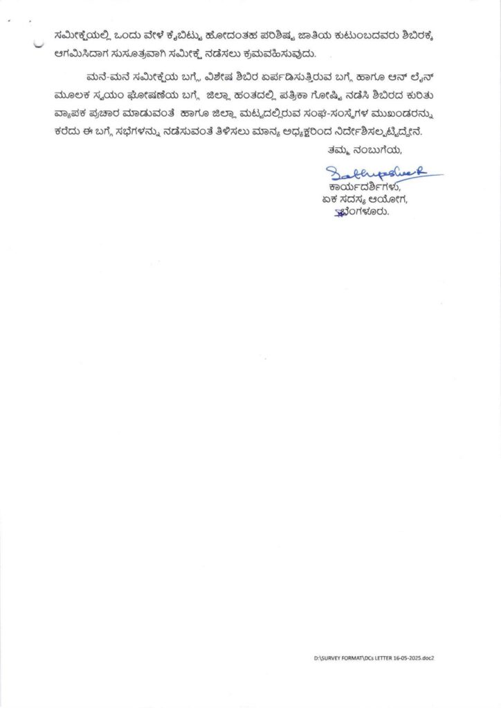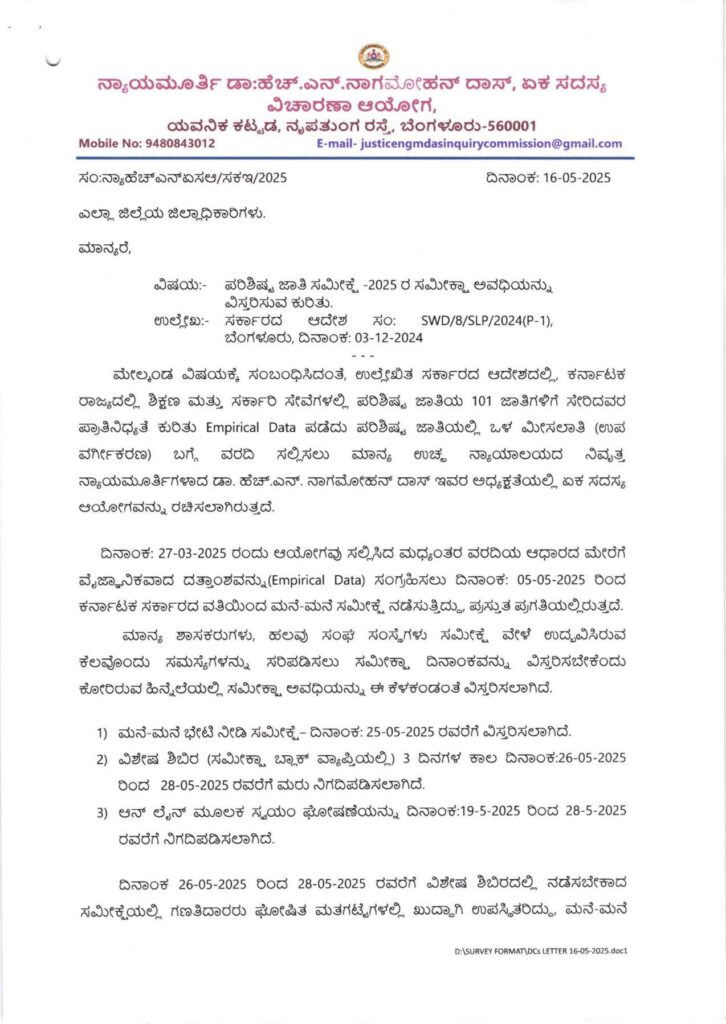 1) ಮನೆ-ಮನೆ ಭೇಟಿ ನೀಡಿ ಸಮೀಕ್ಷೆ- ದಿನಾಂಕ: 25-05-2025 ರವರೆಗೆ ವಿಸ್ತರಿಸಲಾಗಿದೆ.