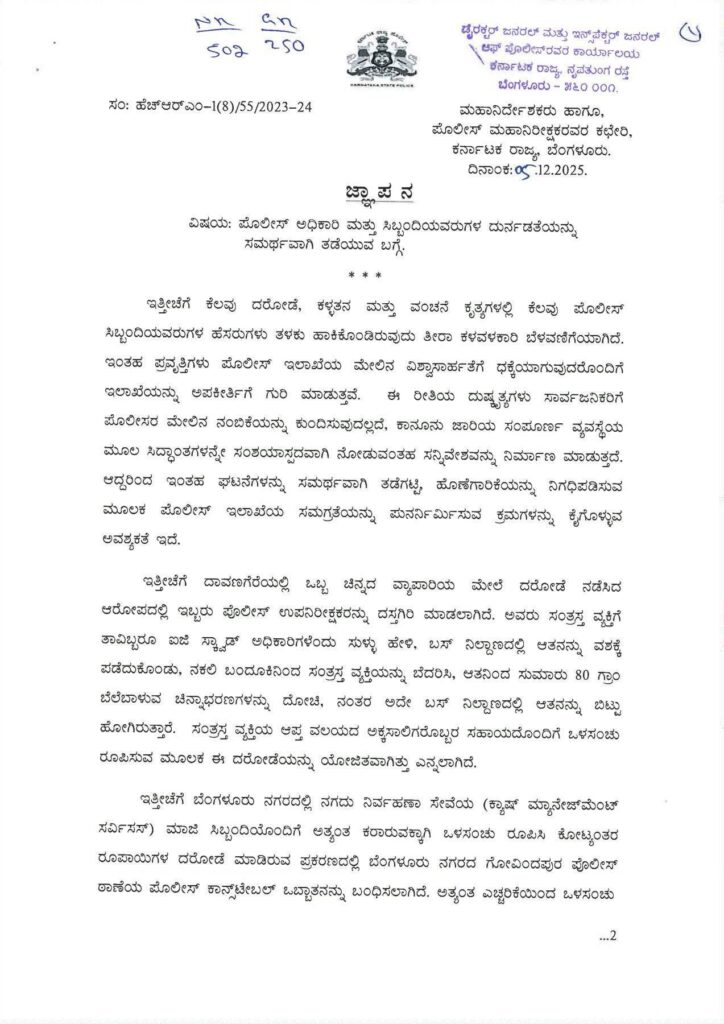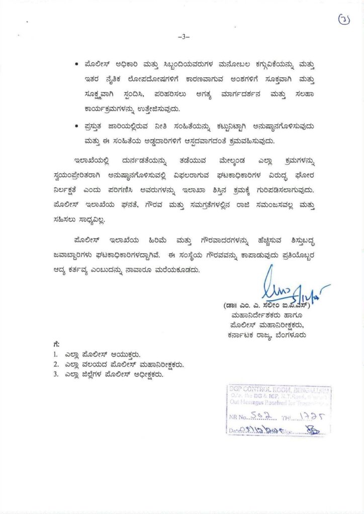 ಅಪರಾಧ ಕೃತ್ಯಗಳಲ್ಲಿ ತೊಡಗಿಕೊಳ್ಳುವ ಪೊಲೀಸ್ ಇಲಾಖೆಯ ಪ್ರತಿಯೊಬ್ಬ ಅಧಿಕಾರಿ/ಸಿಬ್ಬಂದಿಯವರುಗಳಿಗೆ ತೀವ್ರತರವಾದ ಶಿಸ್ತಿನ ಕ್ರಮಗಳನ್ನು ಎದುರಿಸಬೇಕಾಗುತ್ತದೆ ಎಂಬ ಕಠಿಣ ಎಚ್ಚರಿಕೆಯನ್ನು ಈ ಜ್ಞಾಪನದ ಮೂಲಕ ನೀಡಲಾಗಿದೆ.