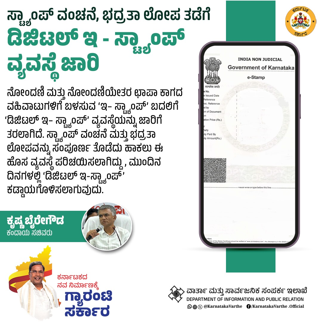 ಬೆಂಗಳೂರು : ನೋಂದಣಿ ಮತ್ತು ನೋಂದಣಿಯೇತರ ಛಾಪಾ ಕಾಗದ ವಹಿವಾಟುಗಳಿಗೆ ಬಳಸುವ ‘ಇ– ಸ್ಟ್ಯಾಂಪ್‌’ ಬದಲಿಗೆ ‘ಡಿಜಿಟಲ್‌ ಇ– ಸ್ಟ್ಯಾಂಪ್‌’ ವ್ಯವಸ್ಥೆಯನ್ನು ಜಾರಿಗೆ ತರಲಾಗಿದೆ. ಸ್ಟ್ಯಾಂಪ್ ವಂಚನೆ ಮತ್ತು ಭದ್ರತಾ ಲೋಪವನ್ನು ಸಂಪೂರ್ಣ ತೊಡೆದು ಹಾಕಲು ಈ ಹೊಸ ವ್ಯವಸ್ಥೆ ಪರಿಚಯಿಸಲಾಗಿದ್ದು, ಮುಂದಿನ ದಿನಗಳಲ್ಲಿ ‘ಡಿಜಿಟಲ್ ಇ-ಸ್ಟ್ಯಾಂಪ್‌’ ಕಡ್ಡಾಯಗೊಳಿಸಲಾಗುವುದು ಎಂದು ಕಂದಾಯ ಸಚಿವರಾದ ಕೃಷ್ಣಭೈರೇಗೌಡ  ತಿಳಿಸಿದ್ದಾರೆ.