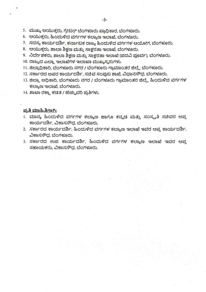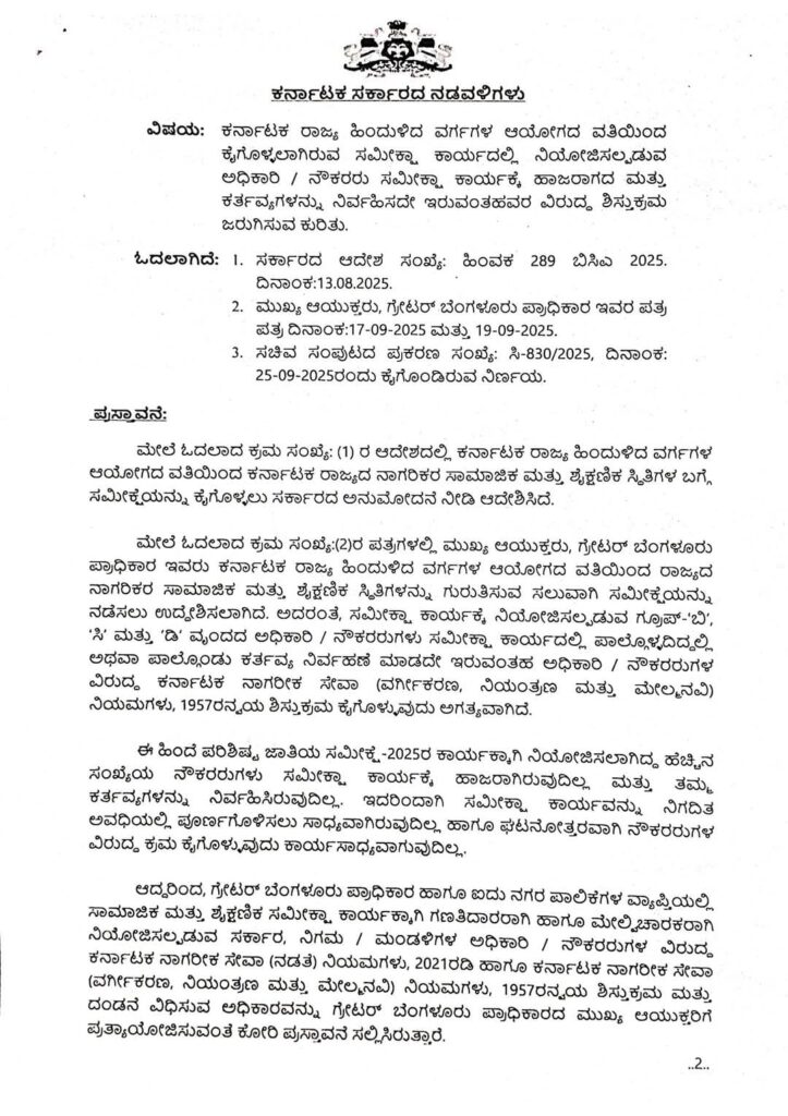 ಪ್ರಸ್ತಾವನೆಯಲ್ಲಿ ವಿವರಿಸಿರುವ ಅಂಶಗಳ ಹಿನ್ನೆಲೆಯಲ್ಲಿ, ಕರ್ನಾಟಕ ರಾಜ್ಯ ಹಿಂದುಳಿದ ವರ್ಗಗಳ ಆಯೋಗದ ವತಿಯಿಂದ ರಾಜ್ಯದ ಎಲ್ಲಾ ನಾಗರಿಕರ ಸಾಮಾಜಿಕ ಮತ್ತು ಶೈಕ್ಷಣಿಕ ಸ್ಥಿತಿಗಳ ಕುರಿತು ಕೈಗೊಳ್ಳಲಾಗಿರುವ ಸಮೀಕ್ಷಾ ಕಾರ್ಯಕ್ಕೆ ನಿಯೋಜಿಸಲ್ಪಡುವ ಇತರೆ ಇಲಾಖೆ, ನಿಗಮ ಮತ್ತು ಮಂಡಳಿಗಳ ಅಧಿಕಾರಿ / ನೌಕರರುಗಳು ಸಮೀಕ್ಷಾ ಕಾರ್ಯದ ಅವಧಿಯಲ್ಲಿ ಕರ್ತವ್ಯಕ್ಕೆ ಹಾಜರಾಗದೇ ಇದ್ದಲ್ಲಿ ಅಥವಾ ಹಾಜರಾಗಿ ಕರ್ತವ್ಯಗಳನ್ನು ಸಮರ್ಪಕವಾಗಿ ನಿರ್ವಹಿಸದೇ ಇದ್ದಲ್ಲಿ ಅಂತಹವರುಗಳ ವಿರುದ್ಧ ಕರ್ನಾಟಕ ನಾಗರೀಕ ಸೇವಾ (ನಡತೆ) ನಿಯಮಗಳು, 2021ರಡಿ ಹಾಗೂ ಕರ್ನಾಟಕ ನಾಗರೀಕ ಸೇವಾ (ವರ್ಗೀಕರಣ, ನಿಯಂತ್ರಣ ಮತ್ತು ಮೇಲ್ಮನವಿ), ನಿಯಮಗಳು, 1957ರ ನಿಯಮ-9ರಡಿ ಶಿಸ್ತುಕ್ರಮ ಜರುಗಿಸಲು ಕರ್ತವ್ಯಲೋಪ ಎಸಗಿದವರನ್ನು ನಿಯಮ-10ರಡಿ ಅಮಾನತ್ತಿನಲ್ಲಿಡಲು ಸಹ ಮುಖ್ಯ ಆಯುಕ್ತರು, ಗ್ರೇಟರ್ ಬೆಂಗಳೂರು ಪ್ರಾಧಿಕಾರ ಇವರಿಗೆ ಅಧಿಕಾರ ಪ್ರತ್ಯಾಯೋಜಿಸಿ ಆದೇಶಿಸಿದೆ.