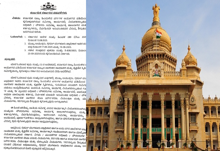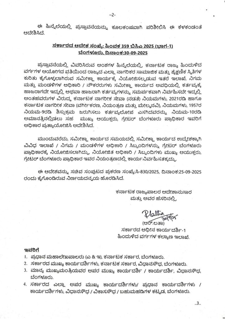 ಮುಂದುವರೆದು, ಸಮೀಕ್ಷಾ ಕಾರ್ಯದ ಸಮಯದಲ್ಲಿ ಸಮೀಕ್ಷಾ ಕಾರ್ಯದ ಉದ್ದೇಶಕ್ಕಾಗಿ ವಿವಿಧ ಇಲಾಖೆ / ನಿಗಮ / ಮಂಡಳಿಗಳ ಅಧಿಕಾರಿ / ಸಿಬ್ಬಂದಿಗಳನ್ನು ಗ್ರೇಟರ್ ಬೆಂಗಳೂರು ಪ್ರಾಧಿಕಾರಕ್ಕೆ ನಿಯೋಜಿಸಲಾಗಿದ್ದು, ನಿಯೋಜಿತ ಅಧಿಕಾರಿ / ಸಿಬ್ಬಂದಿಗಳು ಮುಖ್ಯ ಆಯುಕ್ತರು, ಗ್ರೇಟರ್ ಬೆಂಗಳೂರು ಪ್ರಾಧಿಕಾರ ಇವರ ನಿಯಂತ್ರಣದಲ್ಲಿ ಕಾರ್ಯನಿರ್ವಹಿಸತಕ್ಕದ್ದು.ಈ ಆದೇಶವನ್ನು ಸಚಿವ ಸಂಪುಟದ ಪ್ರಕರಣ ಸಂಖ್ಯೆ:ಸಿ-830/2025, ದಿನಾಂಕ:25-09-2025 ರಂದು ಕೈಗೊಂಡಿರುವ ನಿರ್ಣಯದನ್ವಯ ಹೊರಡಿಸಿದೆ.