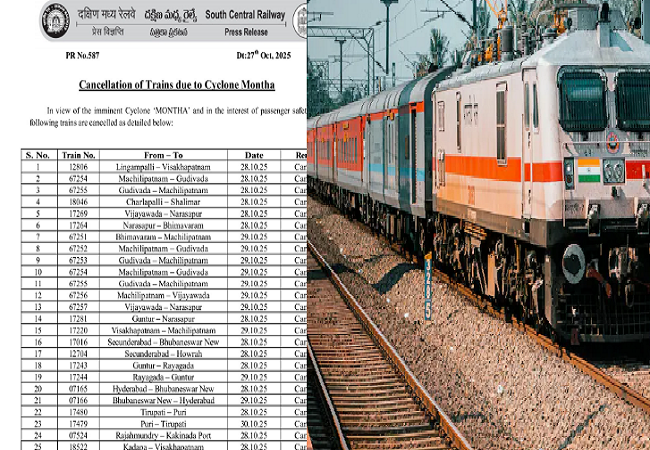 ಮೊಂಥಾ ಚಂಡಮಾರುತದ ಪರಿಣಾಮ ದಕ್ಷಿಣ ಮಧ್ಯ ರೈಲ್ವೆ (SCR) ಸೋಮವಾರ ಹಲವಾರು ರೈಲು ಸೇವೆಗಳನ್ನು ರದ್ದುಗೊಳಿಸುವುದಾಗಿ ಘೋಷಿಸಿದೆ. ಇಲ್ಲಿದೆ ರದ್ದಾದ ರೈಲುಗಳ ಸಂಪೂರ್ಣ ಮಾಹಿತಿ.
