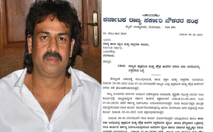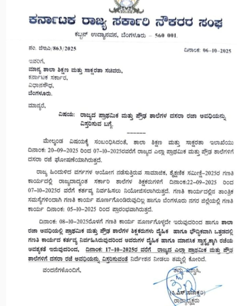 ದಿನಾಂಕ: 08-10-2025ರೊಳಗೆ ಗಣತಿ ಕಾರ್ಯ ಪೂರ್ಣಗೊಳ್ಳದೇ ಇರುವುದರಿಂದ ಹಾಗೂ ಶಾಲಾ ರಜಾ ಅವಧಿಯಲ್ಲಿ ಪ್ರಾಥಮಿಕ ಮತ್ತು ಪ್ರೌಢ ಶಾಲೆಗಳ ಶಿಕ್ಷಕರುಗಳು ದೈಹಿಕ ಹಾಗೂ ಭೌದ್ಧಿಕವಾಗಿ ಒತ್ತಡದಲ್ಲಿ ಗಣತಿ ಕಾರ್ಯದ ಕರ್ತವ್ಯ ನಿರ್ವಹಿಸಿರುವುದರಿಂದ ಅವರುಗಳ ದೈಹಿಕ ಹಾಗೂ ಮಾನಸಿಕ ಸ್ವಾಸ್ಥ್ಯಕ್ಕಾಗಿ ರಜೆಯ ಅವಶ್ಯಕತೆ ಇರುವುದರಿಂದ, ದಿನಾಂಕ: 17-10-2025ರ ವರೆಗೆ ರಾಜ್ಯದ ಎಲ್ಲಾ ಪ್ರಾಥಮಿಕ ಮತ್ತು ಪ್ರೌಢ ಶಾಲೆಗಳಿಗೆ ದಸರಾ ರಜೆ ಅವಧಿಯನ್ನು ವಿಸ್ತರಿಸುವಂತೆ ನಿರ್ದೇಶನ ನೀಡಲು ತಮ್ಮಲ್ಲಿ ಕೋರಿದೆ ಎಂದು ಮನವಿ ಮಾಡಿದ್ದಾರೆ.
