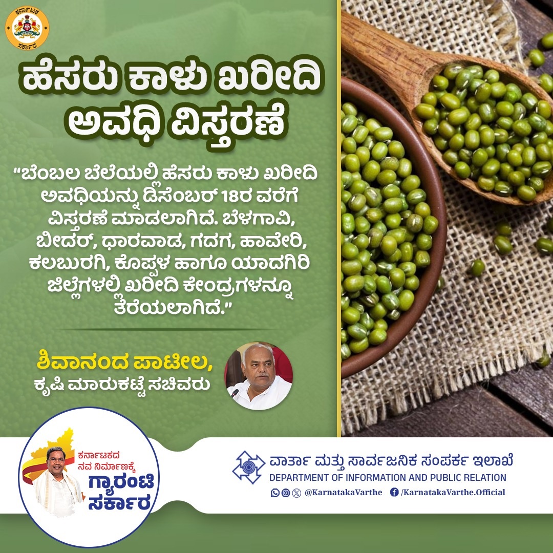 ರಾಜ್ಯದ ರೈತರಿಗೆ ಗುಡ್ ನ್ಯೂಸ್ : ಬೆಂಬಲ ಬೆಲೆಯಲ್ಲಿ ಹೆಸರುಕಾಳು ಖರೀದಿ ಅವಧಿ ಡಿ. 18ರವರೆಗೆ ವಿಸ್ತರಣೆ.!