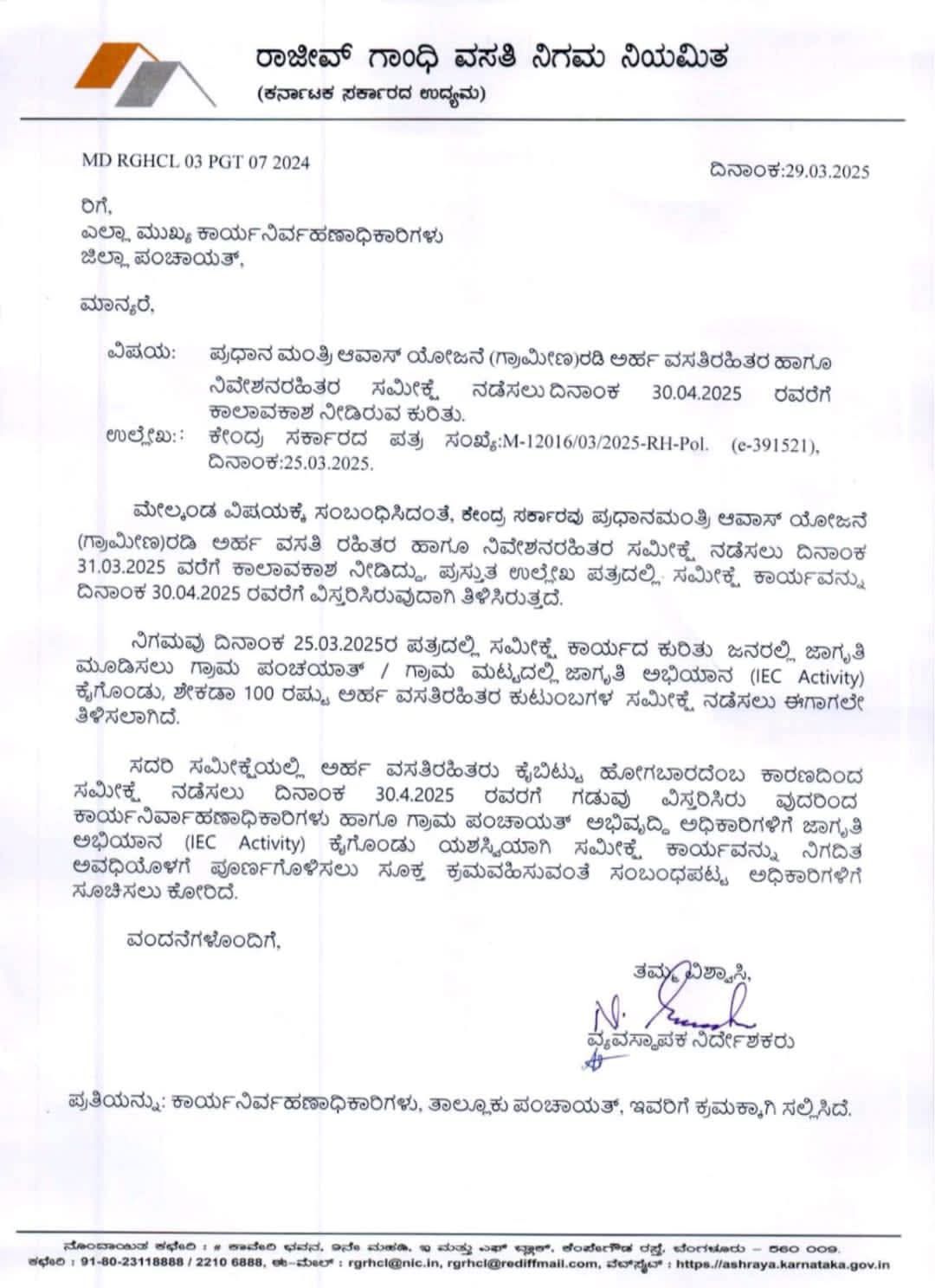 ಸದರಿ ಸಮೀಕ್ಷೆಯಲ್ಲಿ ಅರ್ಹ ವಸತಿರಹಿತರು ಕೈಬಿಟ್ಟು ಹೋಗಬಾರದೆಂಬ ಕಾರಣದಿಂದ ಸಮೀಕ್ಷೆ ನಡೆಸಲು ದಿನಾಂಕ 30.4.2025 ರವರೆಗೆ ಗಡುವು ವಿಸ್ತರಿಸಿರು ವುದರಿಂದ ಕಾರ್ಯನಿರ್ವಾಹಣಾಧಿಕಾರಿಗಳು ಹಾಗೂ ಗ್ರಾಮ ಪಂಚಾಯತ್ ಅಭಿವೃದ್ಧಿ ಅಧಿಕಾರಿಗಳಿಗೆ ಜಾಗೃತಿ ಅಭಿಯಾನ (IEC Activity) ಕೈಗೊಂಡು ಯಶಸ್ವಿಯಾಗಿ ಸಮೀಕ್ಷೆ ಕಾರ್ಯವನ್ನು ನಿಗದಿತ ಅವಧಿಯೊಳಗೆ ಪೂರ್ಣಗೊಳಿಸಲು ಸೂಕ್ತ ಕ್ರಮವಹಿಸುವಂತೆ ಸಂಬಂಧಪಟ್ಟ ಅಧಿಕಾರಿಗಳಿಗೆ ಸೂಚಿಸಲು ಕೋರಿದೆ.