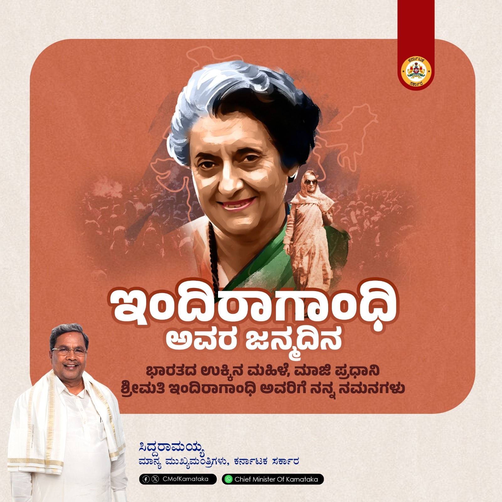 ಸರ್ವರಿಗೂ ಸಮಪಾಲು ನೀಡುವ ಸ್ವಾವಲಂಬಿ ಮತ್ತು ಜಾತ್ಯತೀತ ಭಾರತದ ರೂವಾರಿ ಶ್ರೀಮತಿ ಇಂದಿರಾಗಾಂಧಿಯವರನ್ನು ಅವರ ಹುಟ್ಟುಹಬ್ಬದ ದಿನ ಗೌರವದಿಂದ ನೆನೆಯುತ್ತೇನೆ. ಅವರ ಬಡವರ ಪರವಾದ ಕಾಳಜಿ ಮತ್ತು ಅಭಿವೃದ್ಧಿಯ ಮುನ್ನೋಟದಿಂದ ನಾನು ಪ್ರೇರಿತನಾಗಿದ್ದೇನೆ.