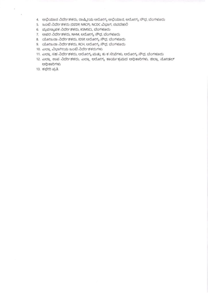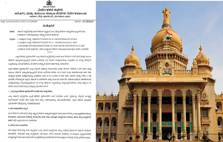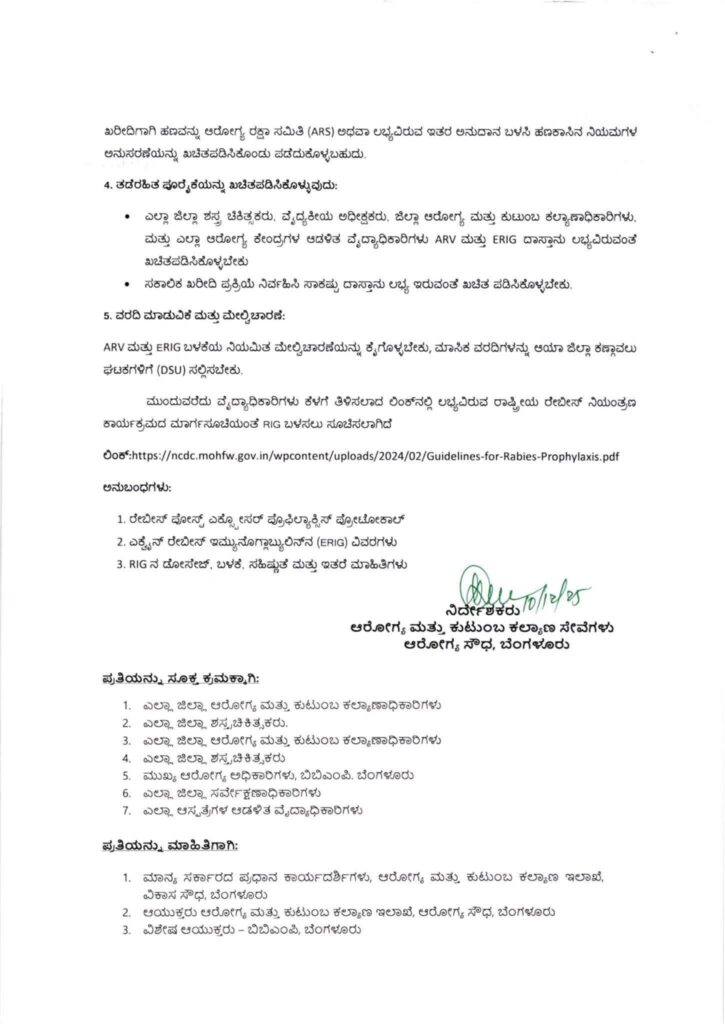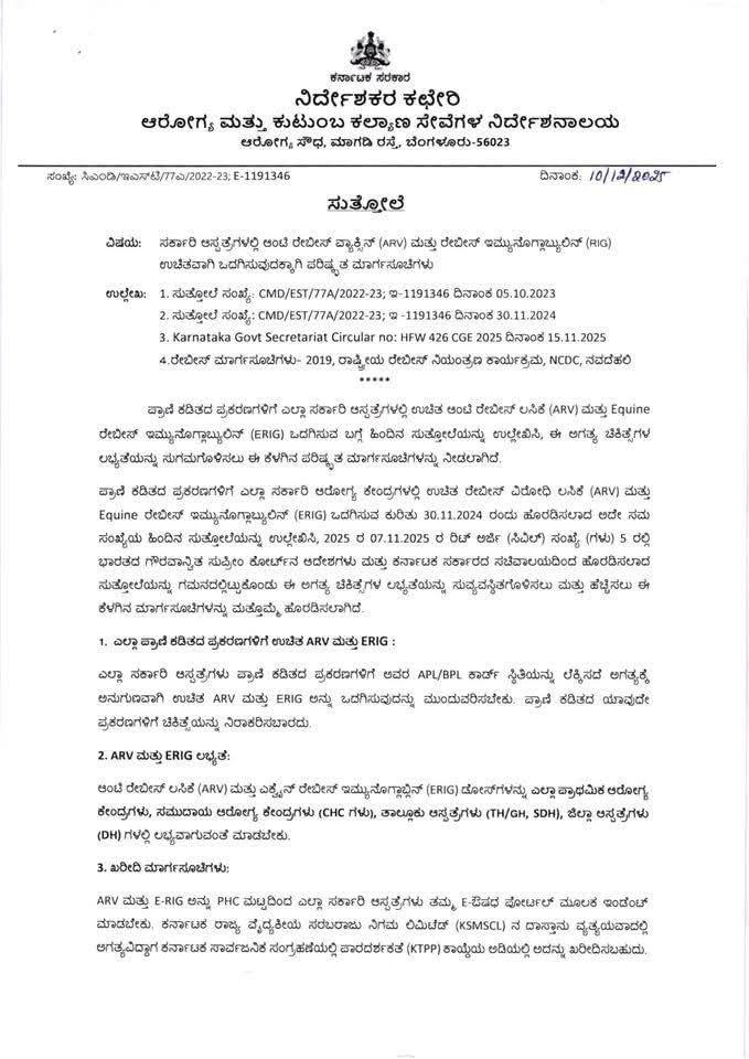 ಪ್ರಾಣಿ ಕಡಿತದ ಪ್ರಕರಣಗಳಿಗೆ ಎಲ್ಲಾ ಸರ್ಕಾರಿ ಆರೋಗ್ಯ ಕೇಂದ್ರಗಳಲ್ಲಿ ಉಚಿತ ರೇಬೀಸ್ ವಿರೋಧಿ ಲಸಿಕೆ (ARV) ಮತ್ತು Equine ರೇಬೀಸ್ ಇಮ್ಯುನೊಗ್ಲಾಬ್ಯುಲಿನ್ (ERIG) ಒದಗಿಸುವ ಕುರಿತು 30.11.2024 ರಂದು ಹೊರಡಿಸಲಾದ ಅದೇ ಸಮ ಸಂಖ್ಯೆಯ ಹಿಂದಿನ ಸುತ್ತೋಲೆಯನ್ನು ಉಲ್ಲೇಖಿಸಿ, 2025 ರ 07.11.2025 ರ ರಿಟ್ ಅರ್ಜಿ (ಸಿವಿಲ್) ಸಂಖ್ಯೆ (ಗಳು) 5 ರಲ್ಲಿ ಭಾರತದ ಗೌರವಾನ್ವಿತ ಸುಪ್ರೀಂ ಕೋರ್ಟ್ ಆದೇಶಗಳು ಮತ್ತು ಕರ್ನಾಟಕ ಸರ್ಕಾರದ ಸಚಿವಾಲಯದಿಂದ ಹೊರಡಿಸಲಾದ ಸುತ್ತೋಲೆಯನ್ನು ಗಮನದಲ್ಲಿಟ್ಟುಕೊಂಡು ಈ ಅಗತ್ಯ ಚಿಕಿತ್ಸೆಗಳ ಲಭ್ಯತೆಯನ್ನು ಸುವ್ಯವಸ್ಥಿತಗೊಳಿಸಲು ಮತ್ತು ಹೆಚ್ಚಿಸಲು ಈ. ಕೆಳಗಿನ ಮಾರ್ಗಸೂಚಿಗಳನ್ನು ಮತ್ತೊಮ್ಮೆ ಹೊರಡಿಸಲಾಗಿದೆ.