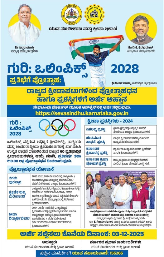 ರಾಜ್ಯದ ಕ್ರೀಡಾಪಟುಗಳಿಂದ ಪ್ರೋತ್ಸಾಹಧನ ಹಾಗೂ ಪ್ರಶಸ್ತಿಗಳಿಗೆ ಅರ್ಜಿ ಆಹ್ವಾನಿಸಲಾಗಿದೆ.
