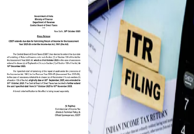 ಅಕ್ಟೋಬರ್ 29 ರಂದು ಕೇಂದ್ರೀಯ ನೇರ ತೆರಿಗೆ ಮಂಡಳಿ (ಸಿಬಿಡಿಟಿ) 2025-26 ರ ಮೌಲ್ಯಮಾಪನ ವರ್ಷಕ್ಕೆ ಆದಾಯ ತೆರಿಗೆ ರಿಟರ್ನ್ಸ್ (ಐಟಿಆರ್) ಮತ್ತು ಆಡಿಟ್ ವರದಿಗಳನ್ನು ಸಲ್ಲಿಸುವ ಗಡುವನ್ನು ವಿಸ್ತರಿಸಿದೆ. ಇದು ತೆರಿಗೆದಾರರು ಮತ್ತು ವೃತ್ತಿಪರರಿಗೆ ಪರಿಹಾರವನ್ನು ಒದಗಿಸಿತು.