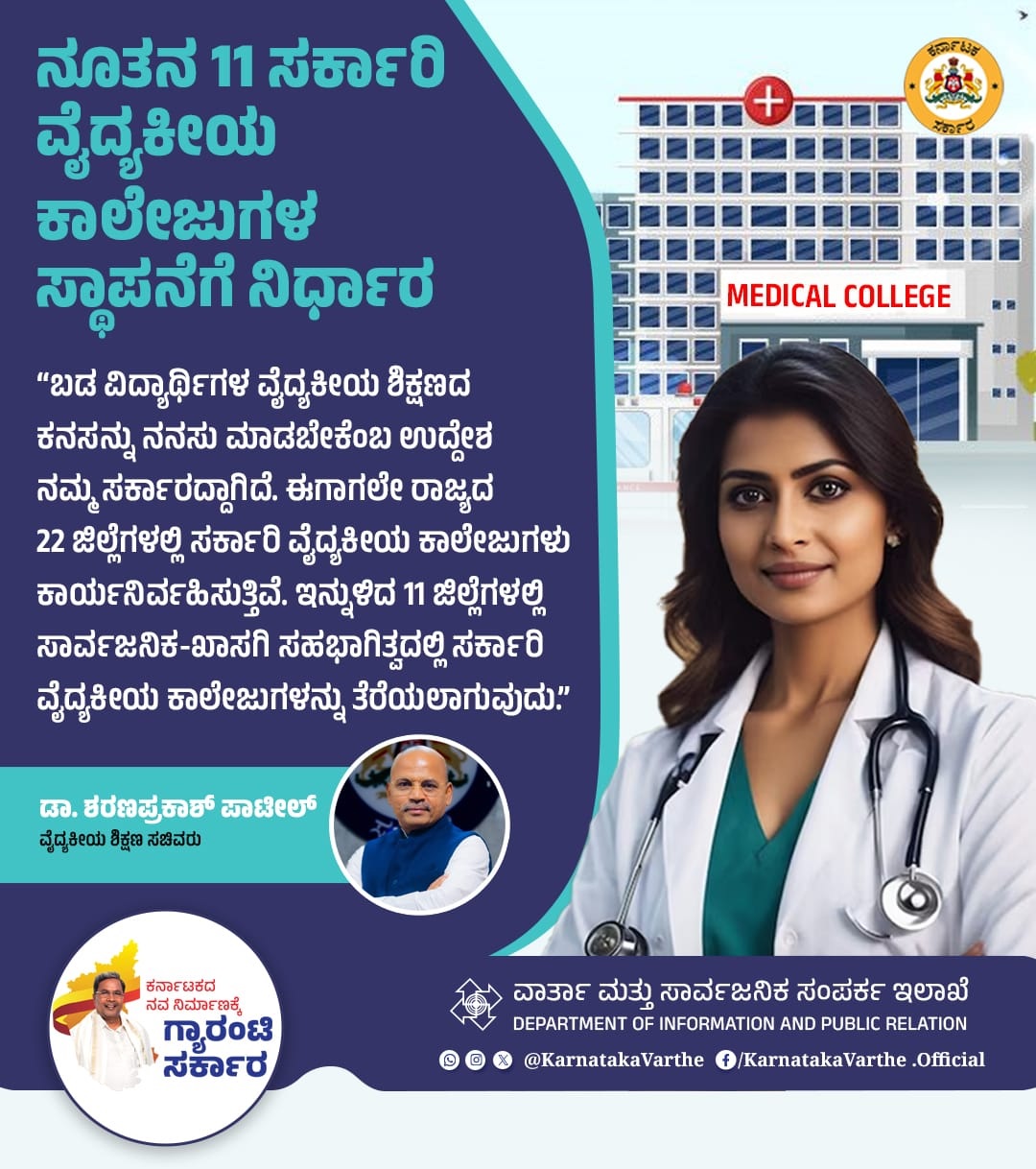 ಬಡ ವಿದ್ಯಾರ್ಥಿಗಳ ವೈದ್ಯಕೀಯ ಶಿಕ್ಷಣದ ಕನಸನ್ನು ನನಸು ಮಾಡಬೇಕೆಂಬ ಉದ್ದೇಶ ನಮ್ಮ ಸರ್ಕಾರದ್ದಾಗಿದೆ. ಈಗಾಗಲೇ ರಾಜ್ಯದ 22 ಜಿಲ್ಲೆಗಳಲ್ಲಿ ಸರ್ಕಾರಿ ವೈದ್ಯಕೀಯ ಕಾಲೇಜುಗಳು ಕಾರ್ಯನಿರ್ವಹಿಸುತ್ತಿವೆ. ಇನ್ನುಳಿದ 11 ಜಿಲ್ಲೆಗಳಲ್ಲಿ ಸಾರ್ವಜನಿಕ-ಖಾಸಗಿ ಸಹಭಾಗಿತ್ವದಲ್ಲಿ ಸರ್ಕಾರಿ ವೈದ್ಯಕೀಯ ಕಾಲೇಜುಗಳನ್ನು ತೆರೆಯಲಾಗುವುದು ಎಂದು ವೈದ್ಯಕೀಯ ಶಿಕ್ಷಣ ಸಚಿವರಾದ ಡಾ. ಶರಣಪ್ರಕಾಶ್ ಪಾಟೀಲ್ ತಿಳಿಸಿದ್ದಾರೆ.