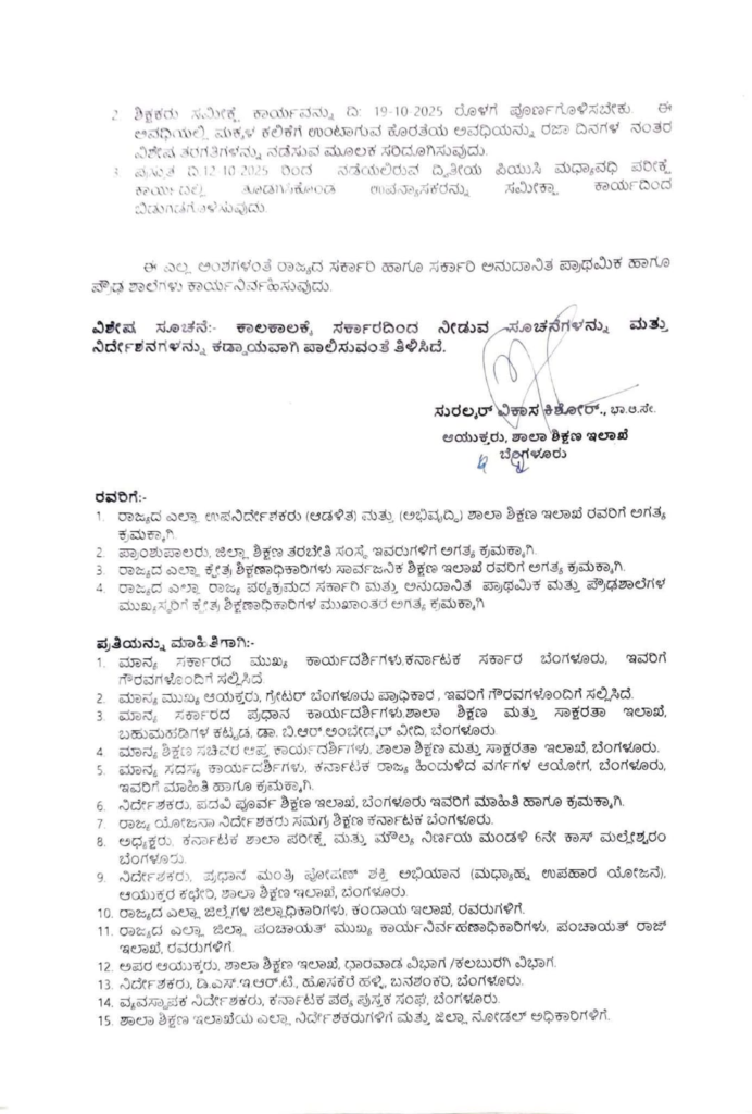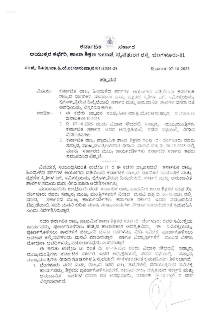 ಮುಖ್ಯಮಂತ್ರಿಗಳು ಇಂದು ವಿಧಾನ ಸೌಧದಲ್ಲಿ ಸನ್ಮಾನ್ಯ ಕರ್ನಾಟಕ ಸರ್ಕಾರ ಇವರ ಅಧ್ಯಕ್ಷತೆಯಲ್ಲಿ ನಡೆದ ಸಭೆಯಲ್ಲಿ ನೀಡಿದ ನಿರ್ದೇಶನಗಳು, ಕರ್ನಾಟಕ ರಾಜ್ಯ ಪ್ರಾಥಮಿಕ ಶಾಲಾ ಶಿಕ್ಷಕರ ಸಂಘ (ರಿ), ಬೆಂಗಳೂರು ಅವರು ಮುಖ್ಯಮಂತ್ರಿಗಳವರಿಗೆ ನೀಡಿದ ಮನವಿ ಪತ್ರ, ದಿ: 06-10-2025 ರಲ್ಲಿ ಸರ್ಕಾರದ ಮುಖ್ಯ ಕಾರ್ಯದರ್ಶಿಗಳು ಕರ್ನಾಟಕ ಸರ್ಕಾರ ಇವರು ನಮೂದಿಸಿದ ಟಿಪ್ಪಣಿ ಅನ್ವಯ ಕರ್ನಾಟಕ ರಾಜ್ಯ ಹಿಂದುಳಿದ ವರ್ಗಗಳ ಆಯೋಗದ ವತಿಯಿಂದ ಕರ್ನಾಟಕ ರಾಜ್ಯದ ನಾಗರಿಕರ ಸಾಮಾಜಿಕ ಮತ್ತು ಶೈಕ್ಷಣಿಕ ಸ್ಥಿತಿಗಳ ಬಗ್ಗೆ ಸಮೀಕ್ಷೆಯನ್ನು ಕೈಗೊಳ್ಳುತಿರುವ ಹಿನ್ನಲೆಯಲ್ಲಿ ಸರ್ಕಾರಿ ಮತ್ತು ಅನುದಾನಿತ ಶಾಲೆಗಳ ಸಮಯ ಮರು ನಿಗದಿ ಮಾಡಿ ಆದೇಶಿಸಲಾಗಿತ್ತು.