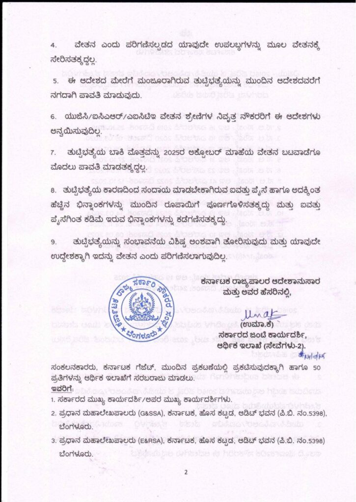 6. ತುಟ್ಟಿಭತ್ಯೆಯ ಬಾಕಿ ಮೊತ್ತವನ್ನು 2025ರ ಅಕ್ಟೋಬರ್ ಮಾಹೆಯ ವೇತನ ಬಟವಾಡೆಗೂ ಮೊದಲು ಪಾವತಿ ಮಾಡತಕ್ಕದ್ದಲ್ಲ.