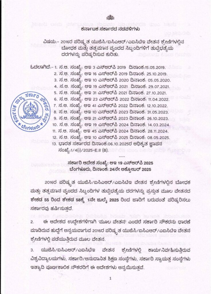 1. 2016ರ ಪರಿಷ್ಕೃತ ಯುಜಿಸಿ/ಐಸಿಎಆರ್/ಎಐಸಿಟಿಇ ವೇತನ ಶ್ರೇಣಿಗಳಲ್ಲಿನ ಬೋಧಕ ಮತ್ತು ತತ್ಸಮಾನ ವೃಂದದ ಸಿಬ್ಬಂದಿಗಳ ತುಟ್ಟಿಭತ್ಯೆಯ ದರಗಳನ್ನು ಪ್ರಸ್ತುತ ಮೂಲ ವೇತನದ ಶೇಕಡ 55 ರಿಂದ ಶೇಕಡ 58ಕ್ಕೆ 1ನೇ ಜುಲೈ 2025 ರಿಂದ ಜಾರಿಗೆ ಬರುವಂತೆ ಪರಿಷ್ಕರಿಸಲು ಸರ್ಕಾರವು ಹರ್ಷಿಸುತ್ತದೆ.