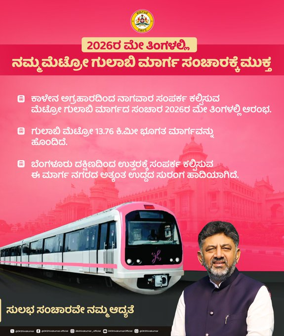 ಈ ಬಗ್ಗೆ ಡಿಸಿಎಂ ಡಿ.ಕೆ. ಶಿವಕುಮಾರ್ ಮಾಹಿತಿ ನೀಡಿದ್ದು, 2026ರ ಮೇ ತಿಂಗಳಲ್ಲಿ ನಮ್ಮಮೆಟ್ರೋ ಗುಲಾಬಿ ಮಾರ್ಗ ಸಂಚಾರಕ್ಕೆ ಮುಕ್ತವಾಗಲಿದೆ. ಡಿ ಕಾಳೇನ ಅಗ್ರಹಾರದಿಂದ ನಾಗವಾರ ಸಂಪರ್ಕ ಕಲ್ಪಿಸುವ ಮೆಟ್ರೋ ಗುಲಾಬಿ ಮಾರ್ಗದ ಸಂಚಾರ 2026ರ ಮೇ ತಿಂಗಳಲ್ಲಿ ಆರಂಭವಾಗಲಿದೆ. ಡಿ ಗುಲಾಬಿ ಮೆಟ್ರೋ 13.76 ಕಿ.ಮೀ ಭೂಗತ ಮಾರ್ಗವನ್ನು ಹೊಂದಿದೆ. ಡಿ ಬೆಂಗಳೂರು ದಕ್ಷಿಣದಿಂದ ಉತ್ತರಕ್ಕೆ ಸಂಪರ್ಕ ಕಲ್ಪಿಸುವ ಈ ಮಾರ್ಗ ನಗರದ ಅತ್ಯಂತ ಉದ್ದದ ಸುರಂಗ ಹಾದಿಯಾಗಿದೆ. ಸುಲಭ ಸಂಚಾರವೇ ನಮ್ಮ ಆದ್ಯತೆಯಾಗಿದೆ ಎಂದು ಹೇಳಿದ್ದಾರೆ.
